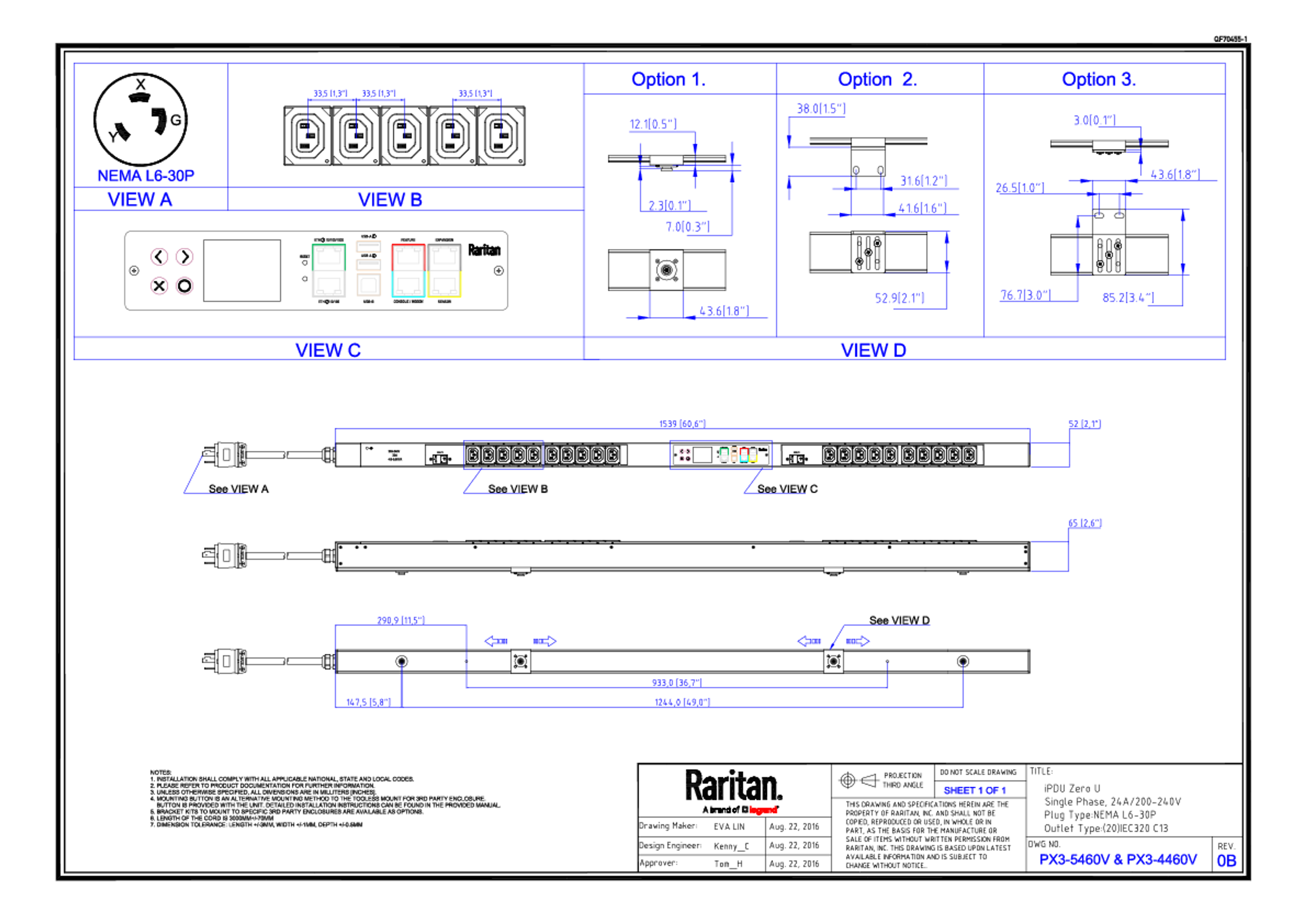1PH, 208V AC, 30A (24A rated); 20 outlets: 20x C13; plug: NEMA L6-30P (Bottom-bottom feed), 5.0kVA; Outlet Metered/Switched, Zero U vertical PDU
