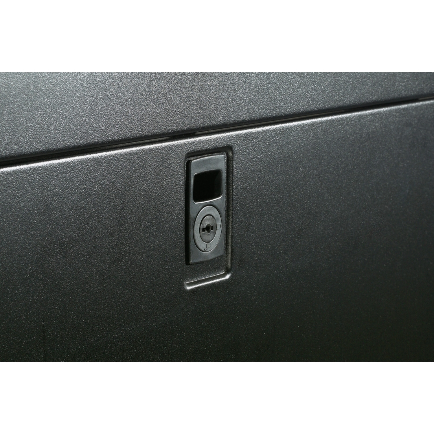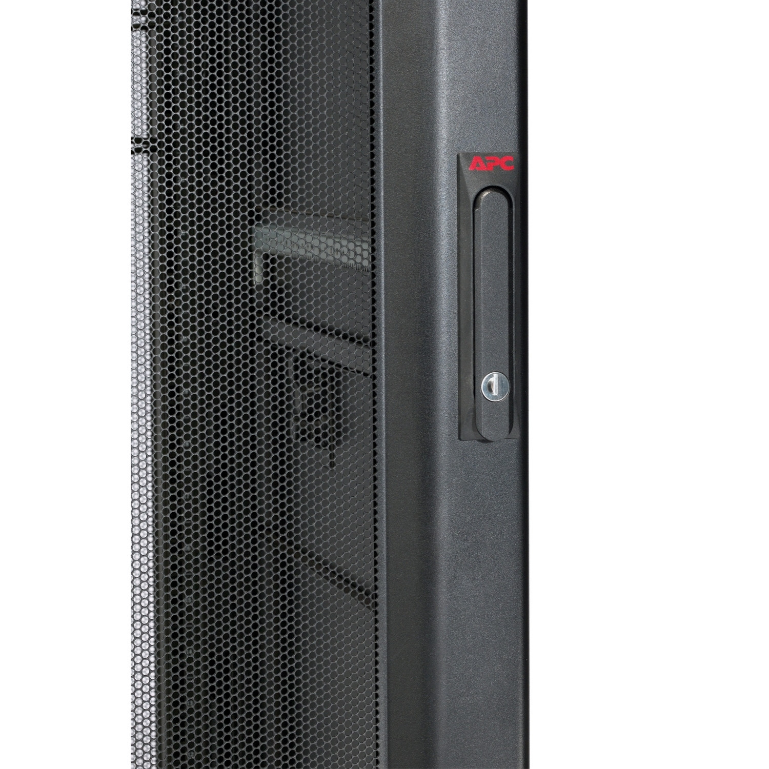The APC AR3100 is a standard enclosure designed for low to medium density server and networking applications. Its compact width optimizes data center space while the 42U height allows for easy maneuverability through doorways. This rack includes essential features such as baying hardware, a documentation CD, keys, keyed-alike doors and side panels, leveling feet, mounting hardware, and pre-installed casters for added convenience.