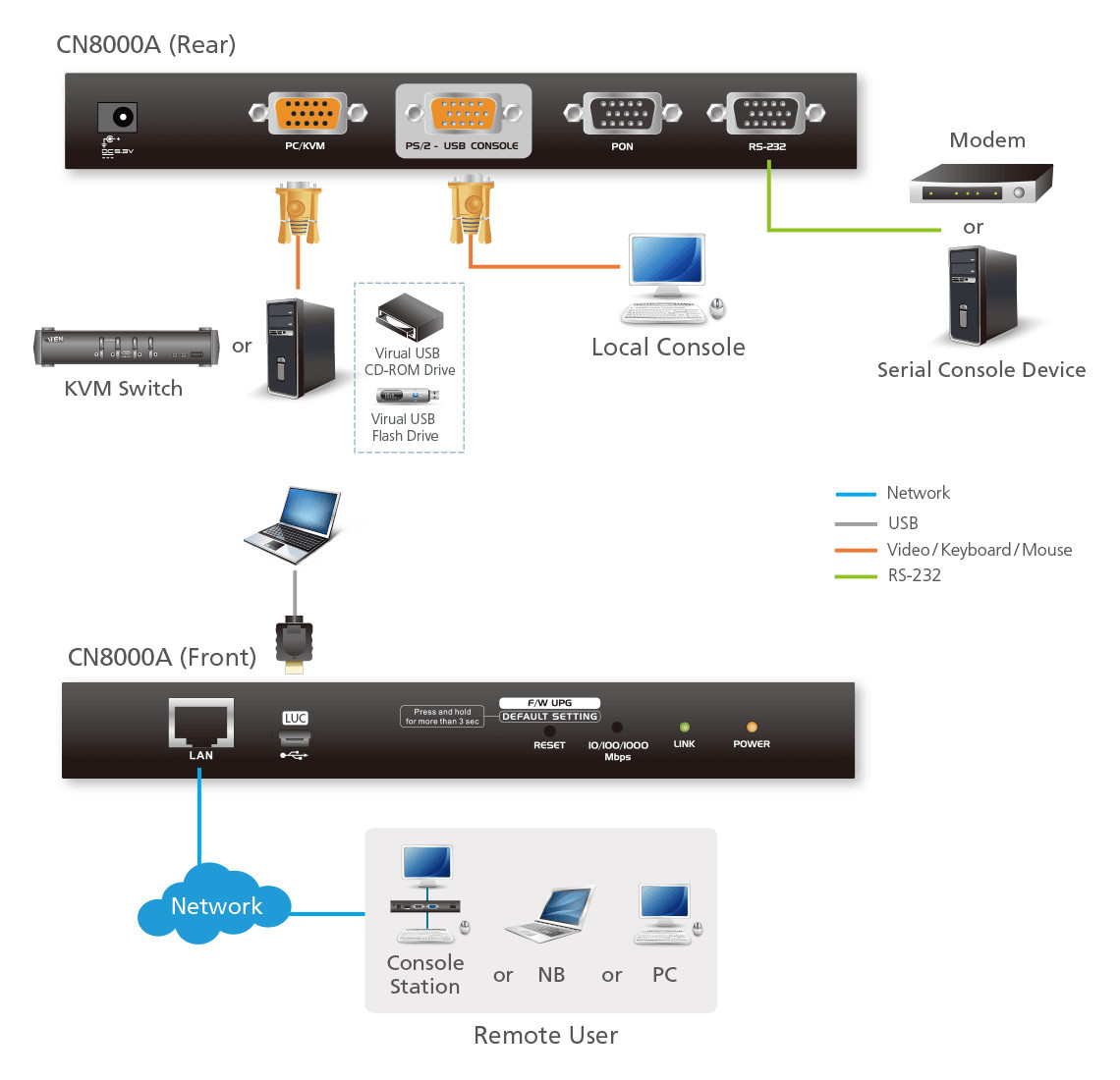 Utilizing standard TCP/IP protocols, the CN8000A enables access to connected servers or KVM switches from any internet-connected computer, regardless of location. It also includes a dedicated RS-232 port for modem access or serial console management, a PON port for ATEN PDU device connection, and USB 2.0 virtual media capability.