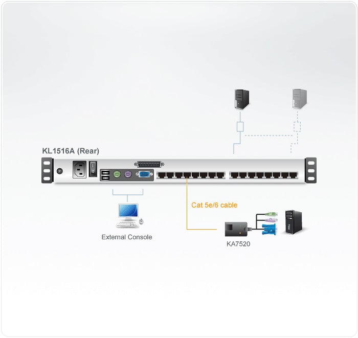 The ATEN KL1516AN is a high-performance KVM switch designed to control up to 16 computers from a single integrated console. Featuring a dual rail LCD monitor, this switch offers exceptional space-saving capabilities and flexibility with its Cat 5e/6 cabling and RJ-45 connectors. The KVM adapter cables allow for automatic conversion, supporting various interfaces including PS/2, USB, and Sun, making it compatible with multiple computer types.