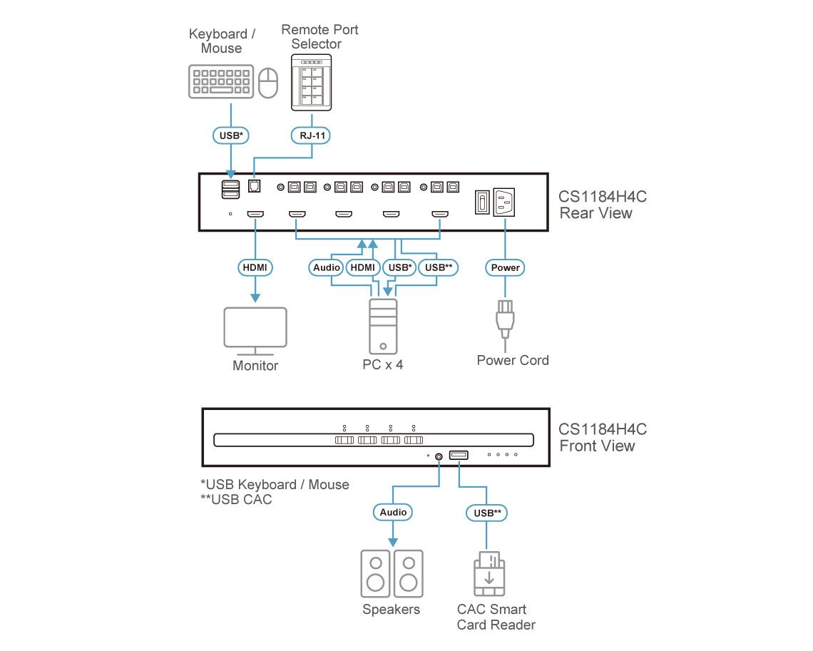 The ATEN PSD PP v4.0 Secure KVM Switch CS1184H4C is engineered to meet the highest security standards for defense and intelligence installations. This KVM switch is compliant with the PSD PP v4.0 standard, certified by the National Information Assurance Partnership (NIAP), ensuring robust data protection and secure management of multiple computer sources.