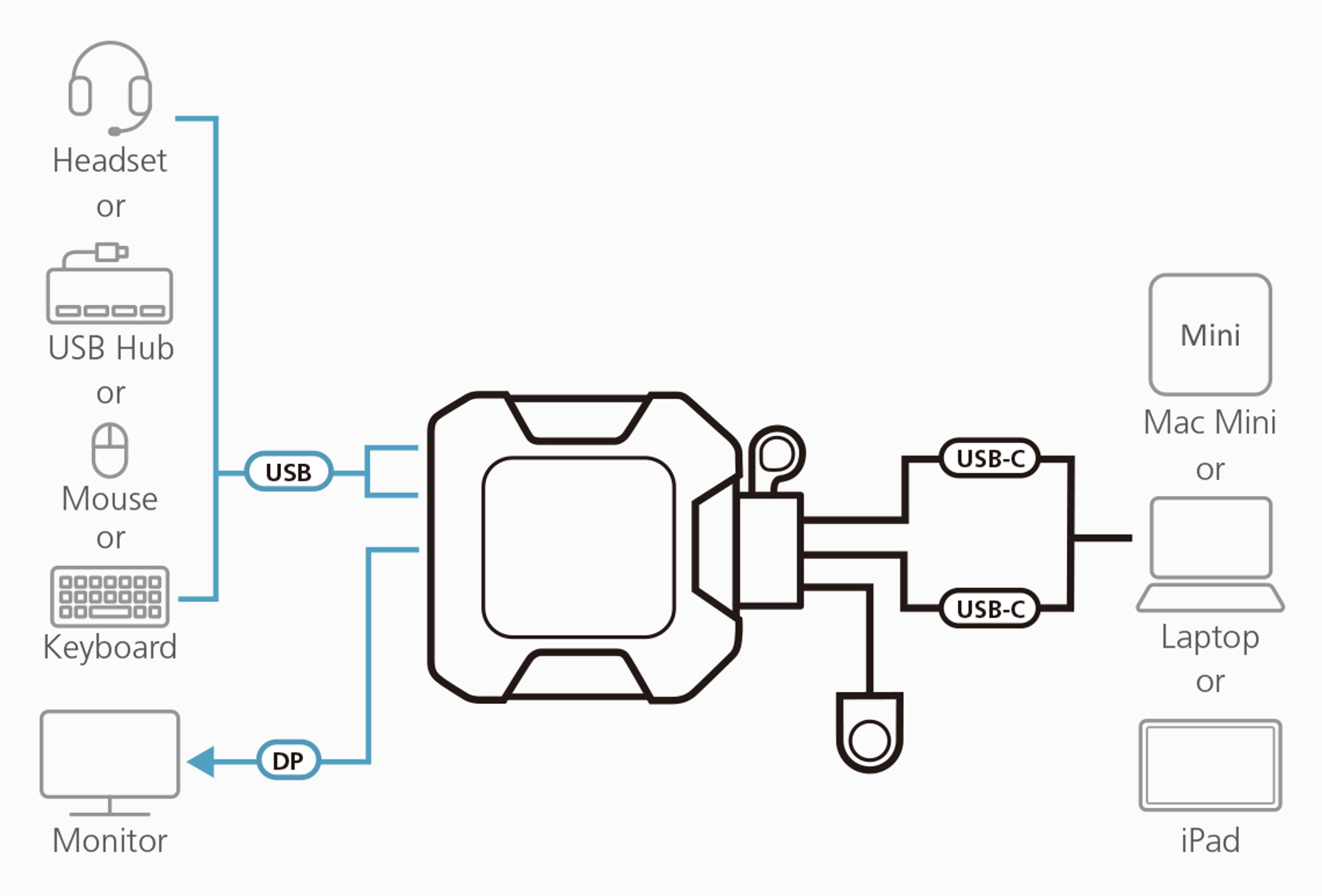 - Supports two USB and one DisplayPort downstream ports for enhanced peripheral sharing.