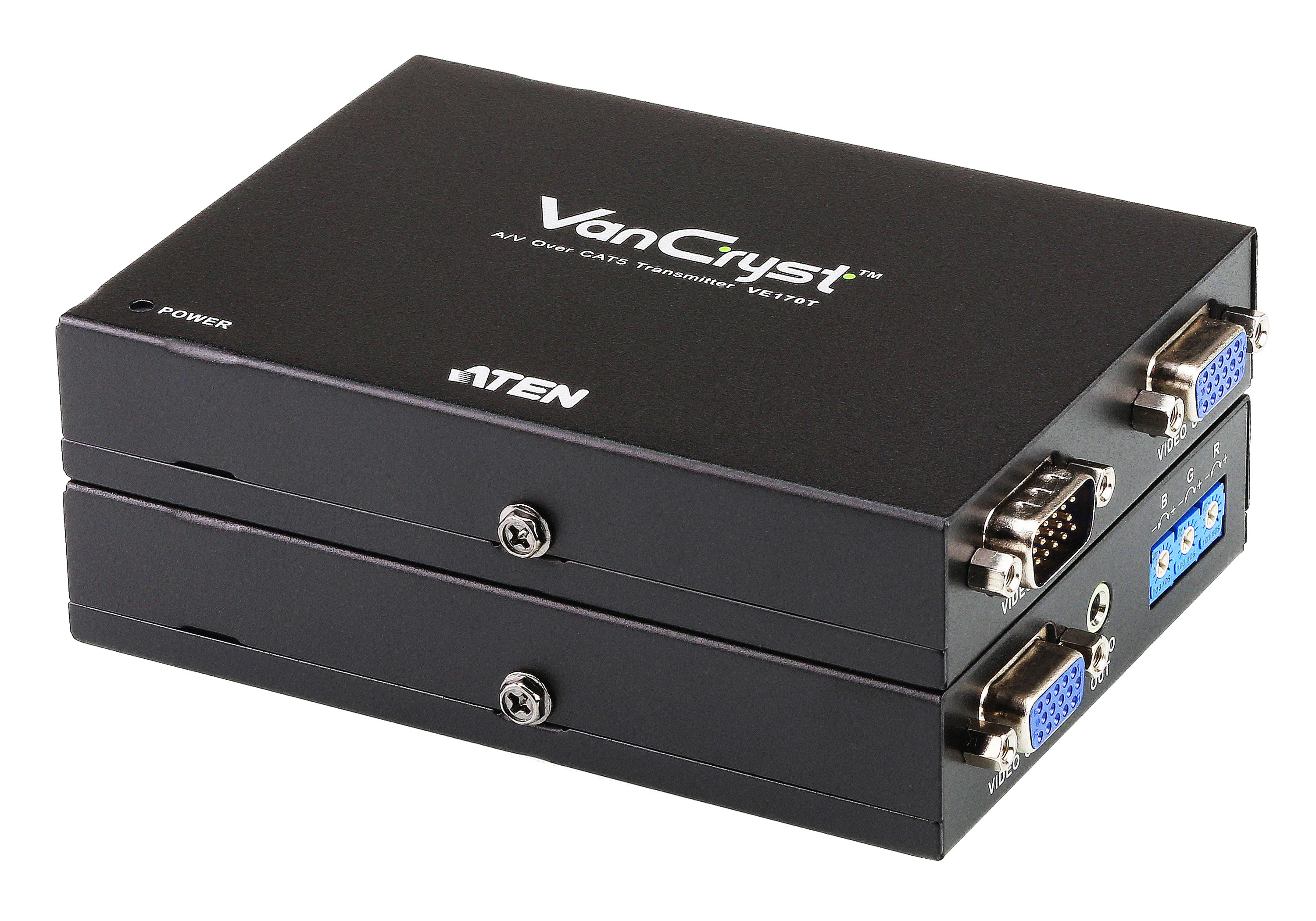 The ATEN VE170 VGA / Audio Cat 5 Extenders are the perfect solution for transmitting high-quality audio and video content over long distances. This cost-effective system includes a transmitter (VE170T) and a receiver (VE170R), allowing you to connect a VGA display or projector up to 300 meters (1000 feet) away from the video source using a single Cat 5e cable.