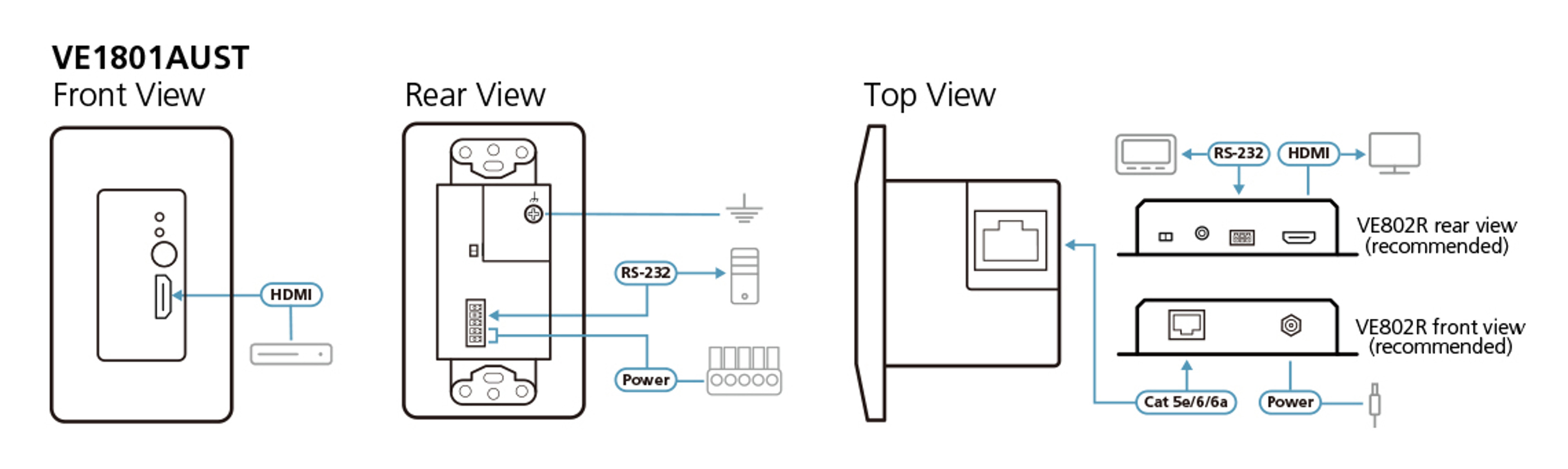 With the built-in PoH (Power over HDBaseT) function, the VE1801AUST receives power from a connected PoH PSE supported receiver, simplifying power line deployment. Additionally, the share function enables remote source switching when connected to compatible receivers, such as the VP1421, enhancing convenience for AV extension.