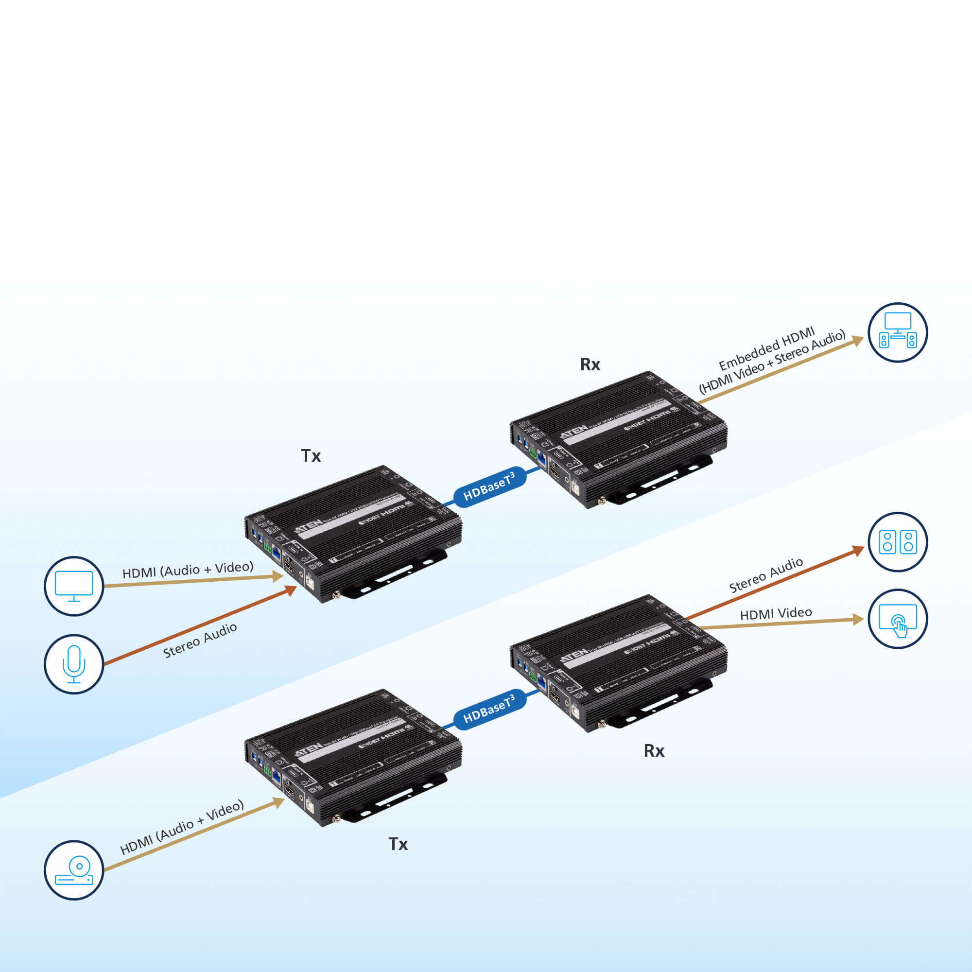The VE1843 is ATEN’s innovative video transceiver that combines the functions of a transmitter and receiver into a single unit, providing unparalleled flexibility for your AV solutions. With HDBaseT 3.0 technology, it extends True 4K uncompressed signals up to 100 meters over a single Cat 6a cable, ensuring zero latency for seamless video transmission.