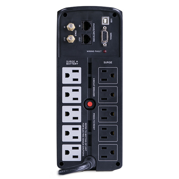 This UPS offers a robust capacity of 1000VA/600W and includes 10 NEMA 5-15R outlets—five with battery backup and surge protection, and five with surge protection only. It is equipped with a 12-volt maintenance-free sealed lead acid battery for reliable power during outages.