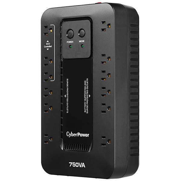 This UPS provides a capacity of 750VA/450W and includes 12 NEMA 5-15R outlets, with 3 ECO mode outlets that automatically power down peripherals when your computer is off or in sleep mode (USB connection required), helping reduce energy consumption. Four widely spaced outlets accommodate bulky transformer plugs.