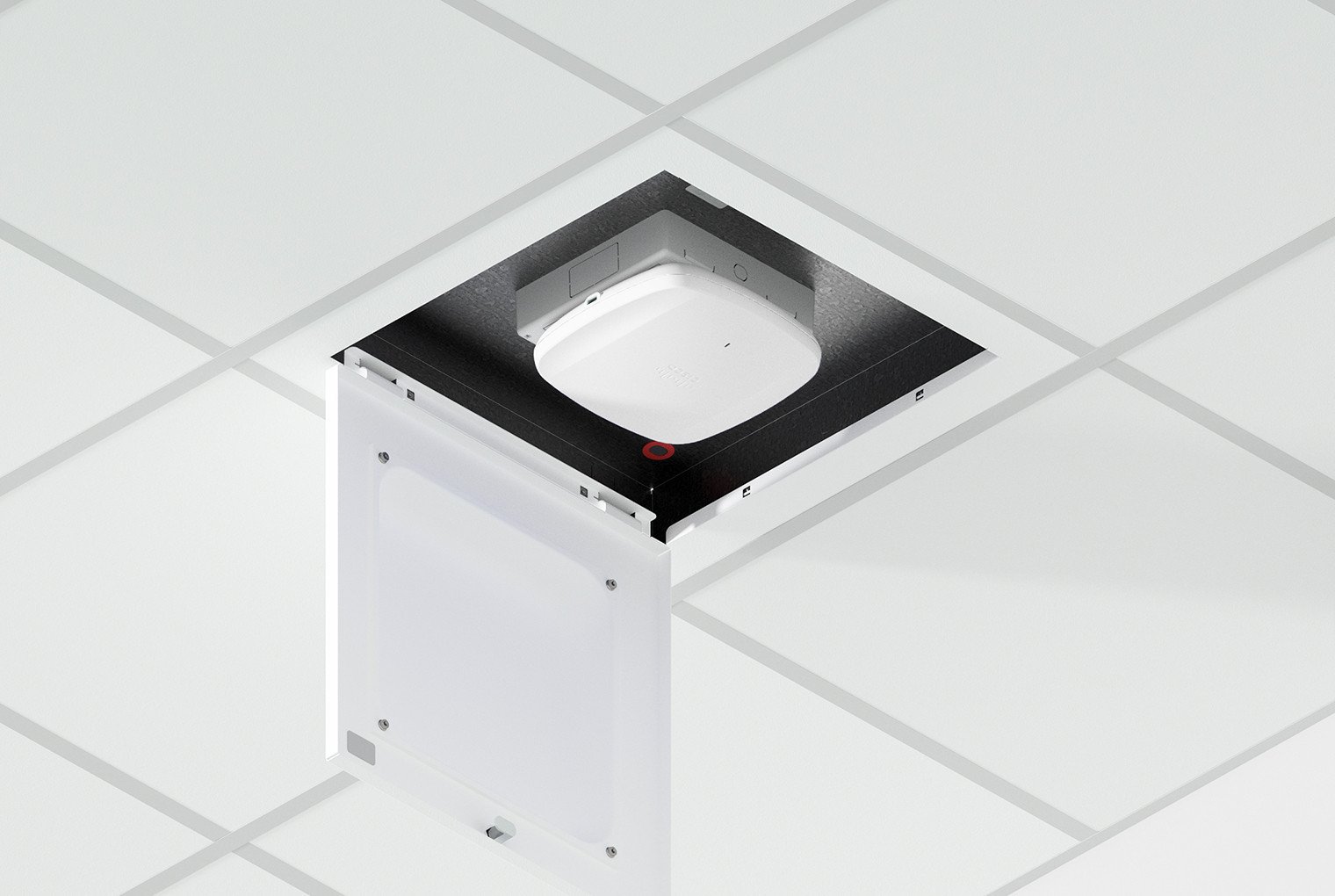 Locking Suspended Ceiling Tile Access Point Enclosure, 3"H x 18.5"W x 18.5"D (76 mm x 470 mm x 470 mm) Back Box, Juniper AP47 Access Point Door, Tegular Style Flange