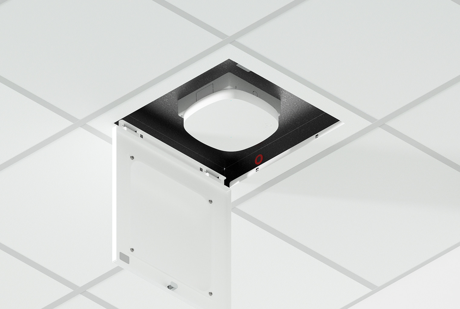 Locking Suspended Ceiling Tile Access Point Enclosure, 3"H x 18.5"W x 18.5"D (76 mm x 470 mm x 470 mm) Back Box, White ABS Plastic Dome Door, Lay-in Style Flange