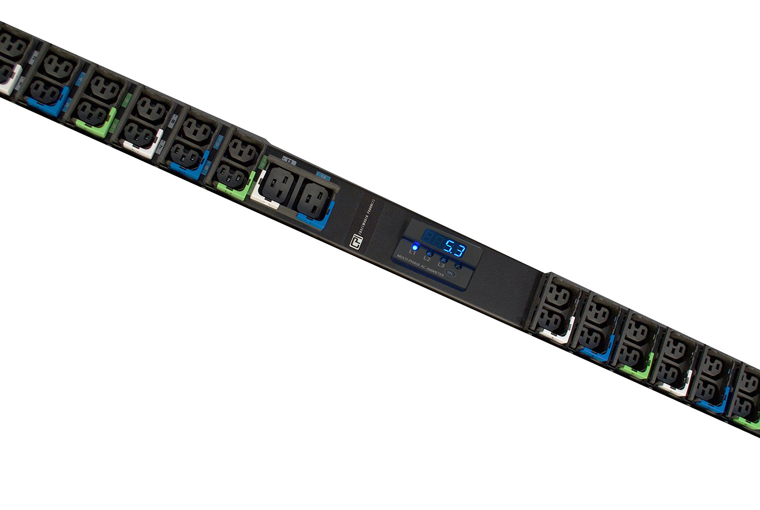 Metered eConnect® PDU; White; Vertical; For 42U or Higher Cabinets; IEC 60309 32A 3P+N+E Input; (30) C13+(12) C19 Outlets; 18.4kW (UL)/23kW (CE); 149°F (65°C); Phase-Balance Locking Outlets; 100% Rated Hydraulic Magnetic Breakers; Local Meter; Tool-less Mounting