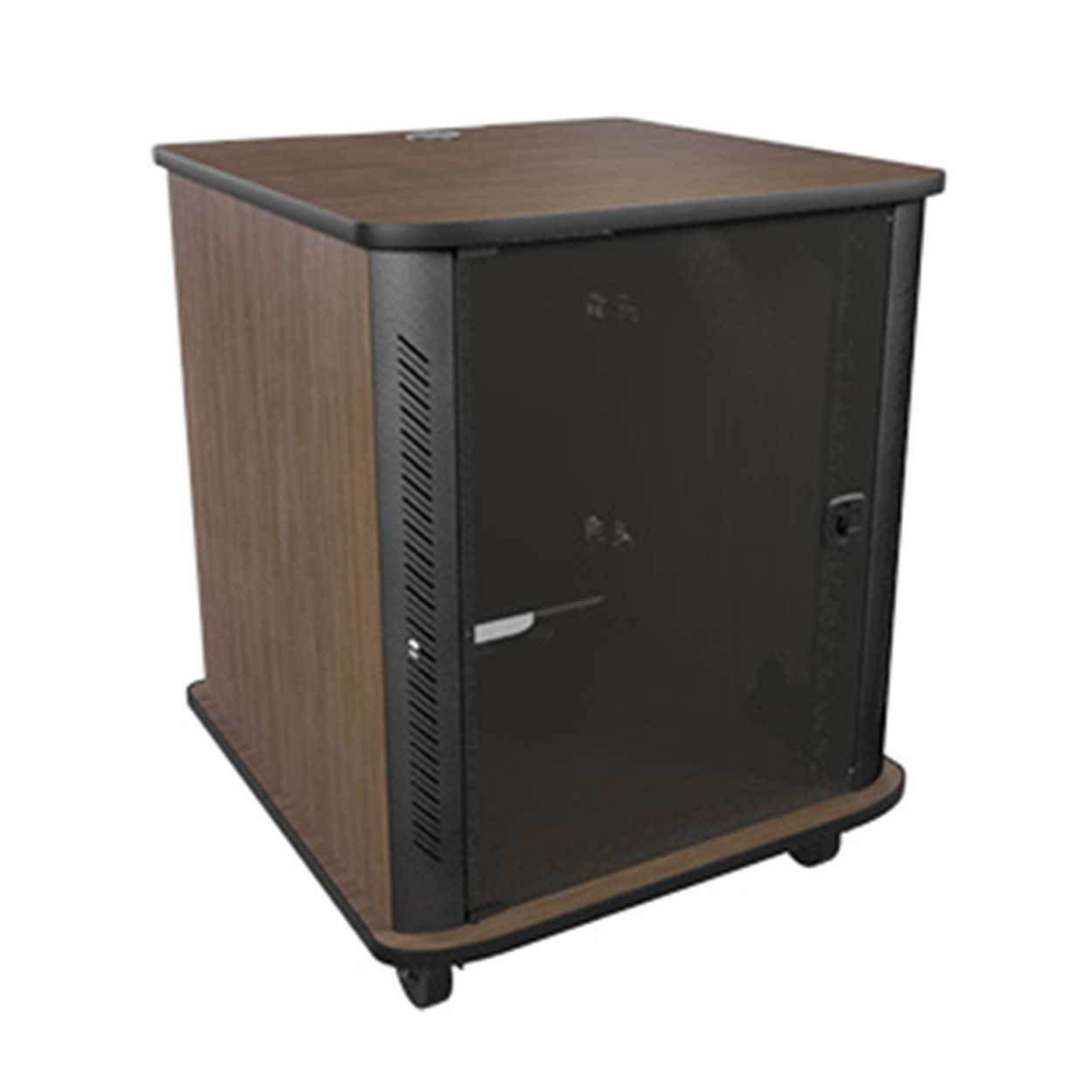 Optimized for passive cooling, the cabinet supports an optional energy-saving thermostatic blower kit to maintain optimal operating temperatures. The locking glass front door offers security and visibility, while the included 10-32 threaded adjustable front rail allows flexible equipment mounting. Additionally, an optional flat screen mount accommodates most monitors up to 32 inches, making it ideal for mobile presentations and professional setups.