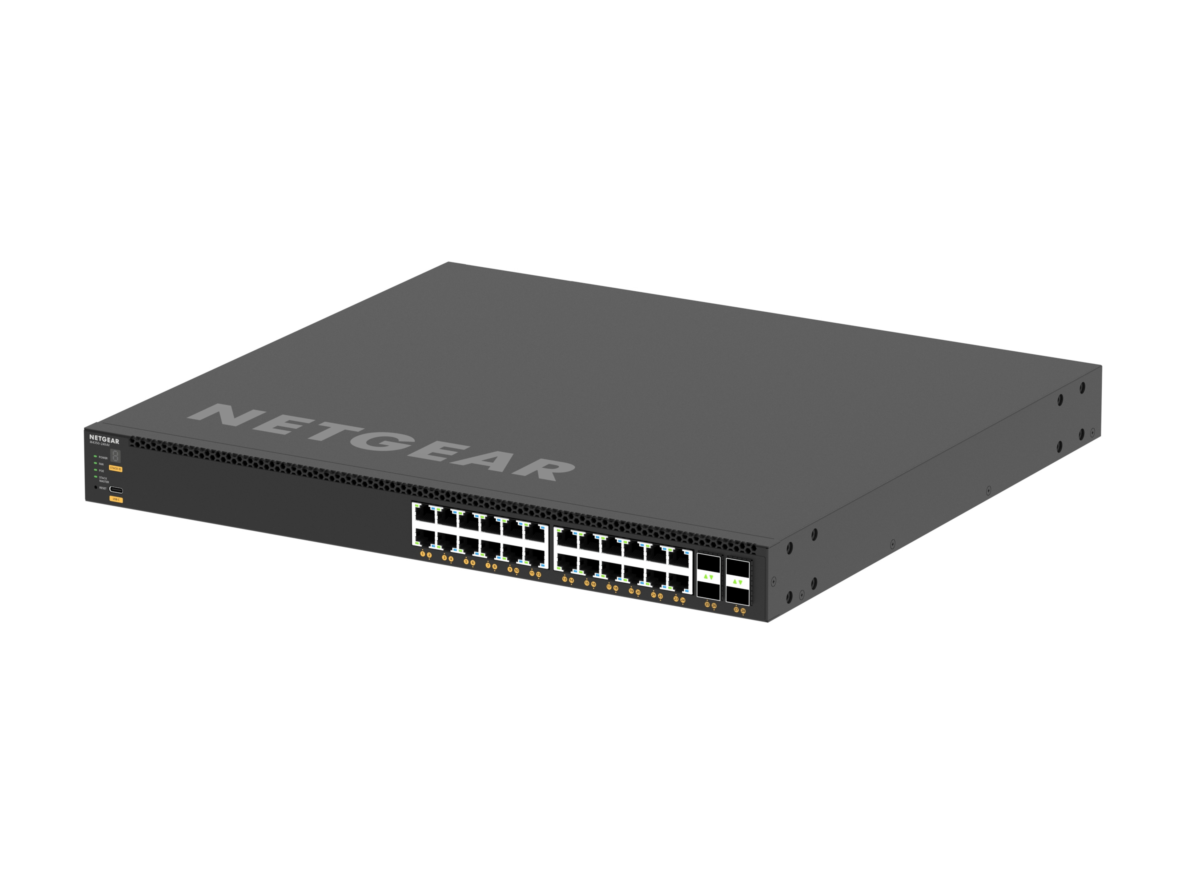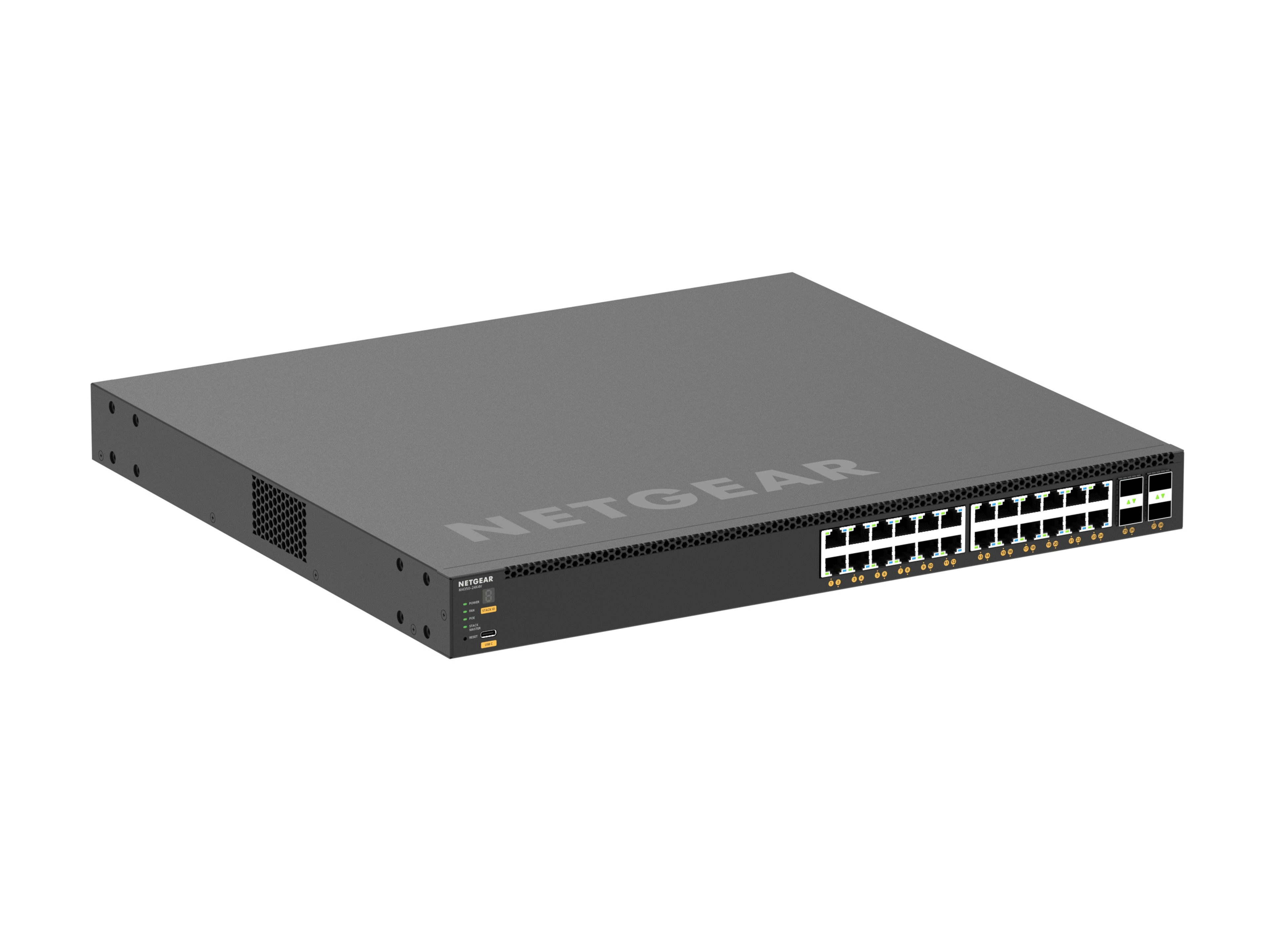 The NETGEAR M4350-24X4V is a powerful and versatile managed L3 switch designed for high-performance AV over IP applications. With 24 10G/Multi-Gig PoE+ ports and 4 25GBASE-X SFP28 uplinks, this switch provides exceptional throughput and flexibility.