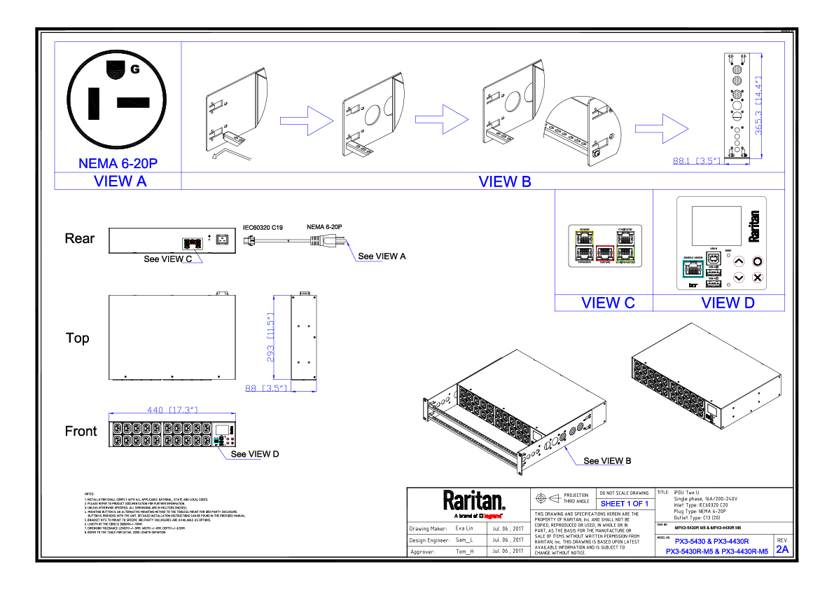1PH, 208V AC, 20A (16A rated), 20 outlets: IEC C-13, plug: NEMA 6-20P, 3.3kVA,2U horizontal PDU, Ethernet, serial, 2 x USB-A, USB-B and sensor connections.