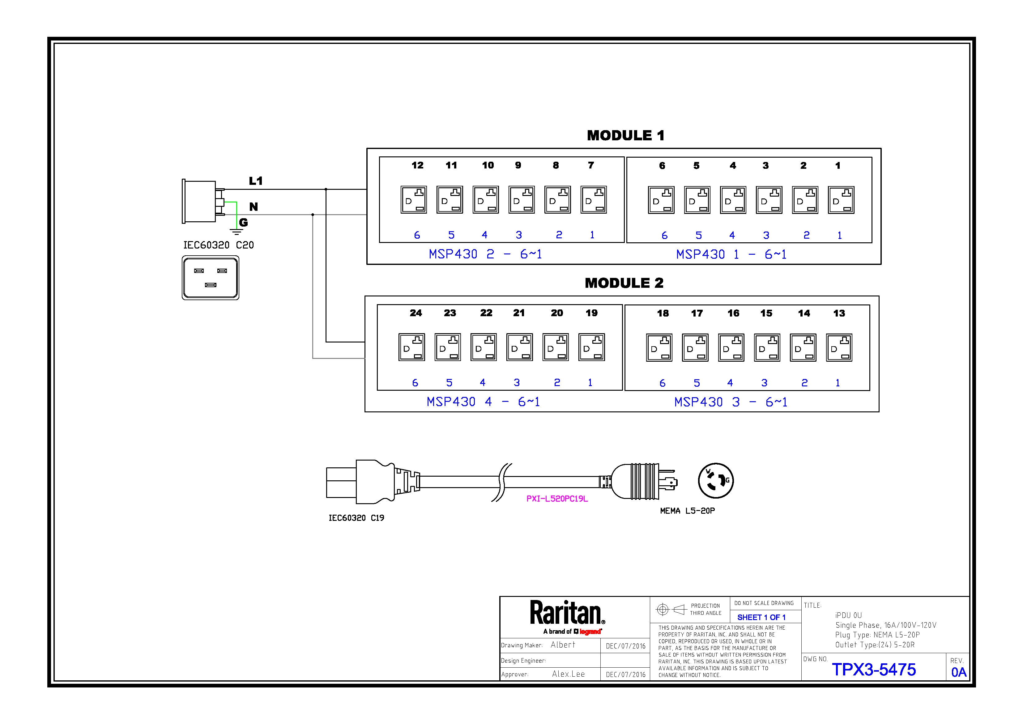 | 1PH, 120V AC, 20A (16A rated): 24 outlets: NEMA L5-20R; plug: NEMA 5-20P, (bottom/end feed 1.9kVA, Outlet Meter/Switched, Zero U |