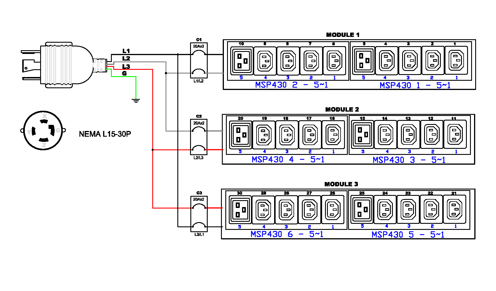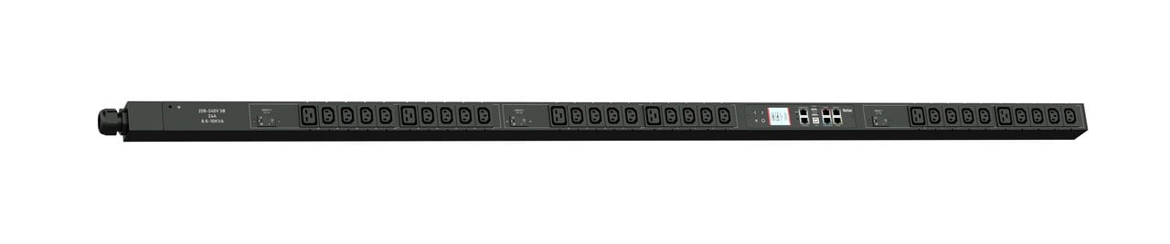 3PH, 208V AC, 30A (24A/PH rated), 30 outlets: 24 x IEC C-13, 6 x IEC C-19, plug:NEMA L15-30P (Delta, bottom/bottom feed), 8.6kVA, Zero U vertical PDU,Ethernet, serial, 2 x USB-A, USB-B and sensor connections