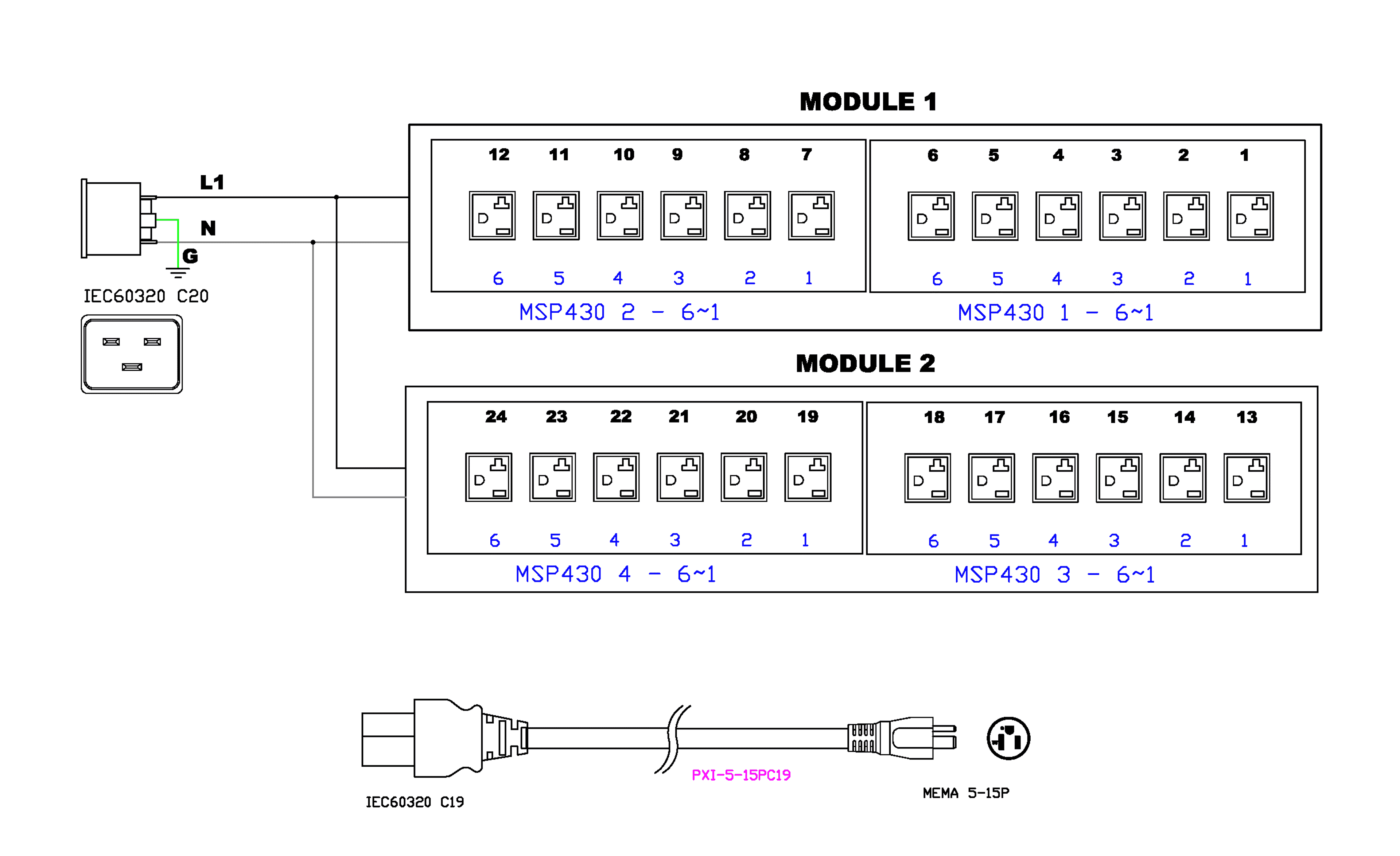 1PH, 120V AC, 15A (12A rated); 24 outlets: 24x NEMA 5-20R; plug: NEMA 5-15P (Bottom-bottom feed), 1.4kVA; Outlet Metered, Zero U vertical PDU