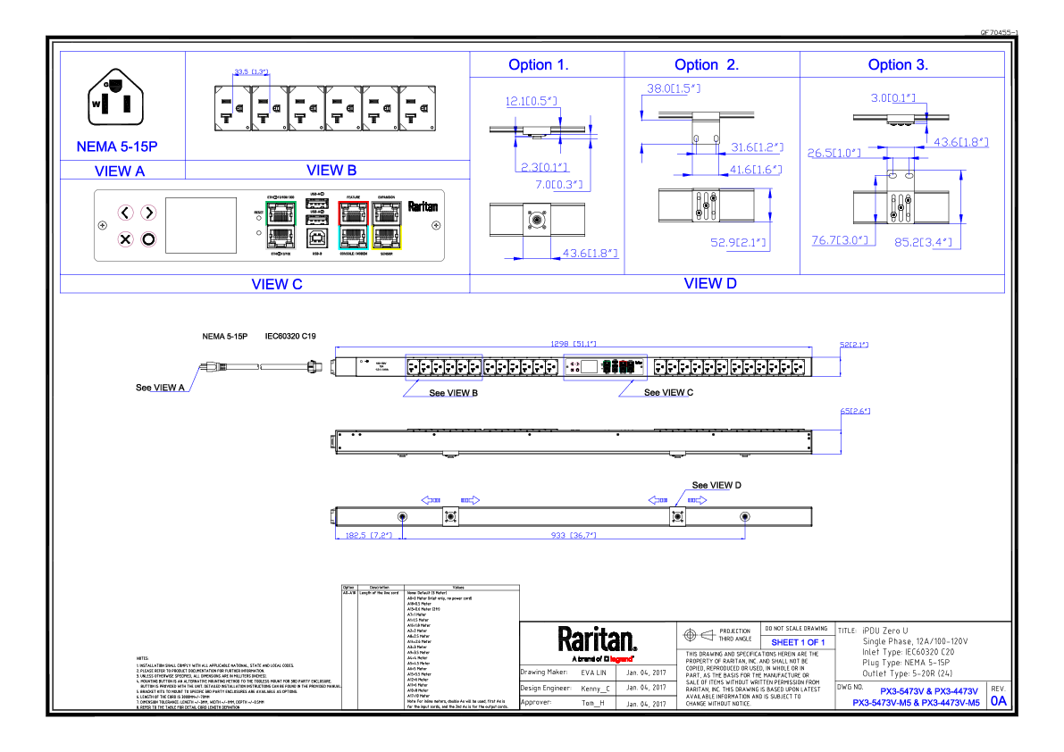 1PH, 120V AC, 15A (12A rated); 24 outlets: 24x NEMA 5-20R; plug: NEMA 5-15P (Bottom-bottom feed), 1.4kVA; Outlet Metered, Zero U vertical PDU