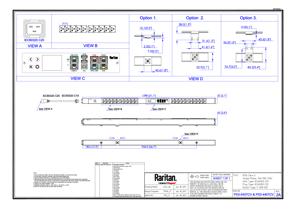 1PH, 120V AC, 16A (16A rated); 20 outlets: 20x NEMA 5-20R; plug: IEC 60320 C20 (Bottom-bottom feed), 1.9kVA; Outlet Metered, Zero U vertical PDU