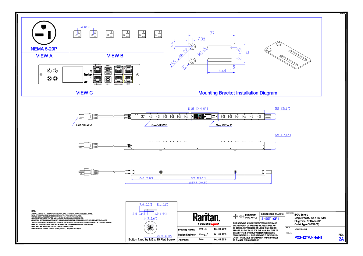 1PH, 120V AC, 20A (16A rated); 12 outlets: 12x NEMA 5-20R; plug: NEMA 5-20P (Top-top feed), 1.9kVA; Unit Metered, Zero U vertical PDU