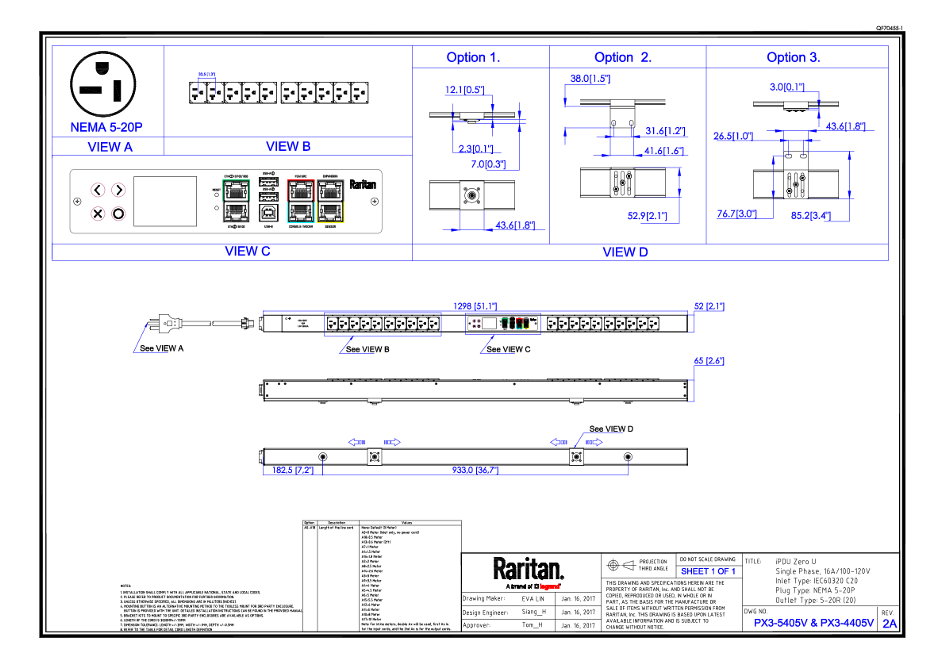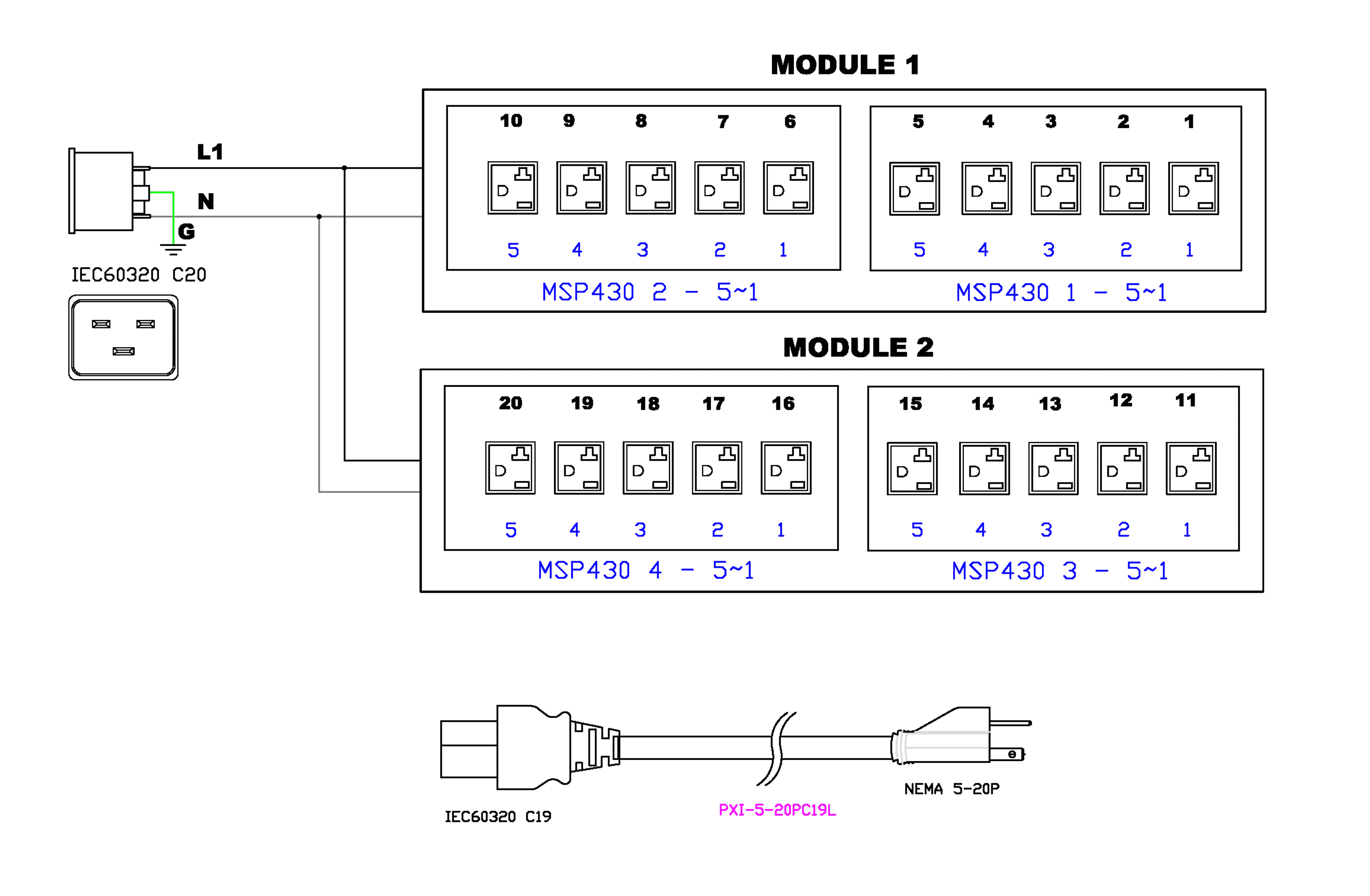 1PH, 120V AC, 20A (16A rated); 20 outlets: 20x NEMA 5-20R; plug: NEMA 5-20P (Bottom-bottom feed), 1.9kVA; Outlet Metered, Zero U vertical PDU