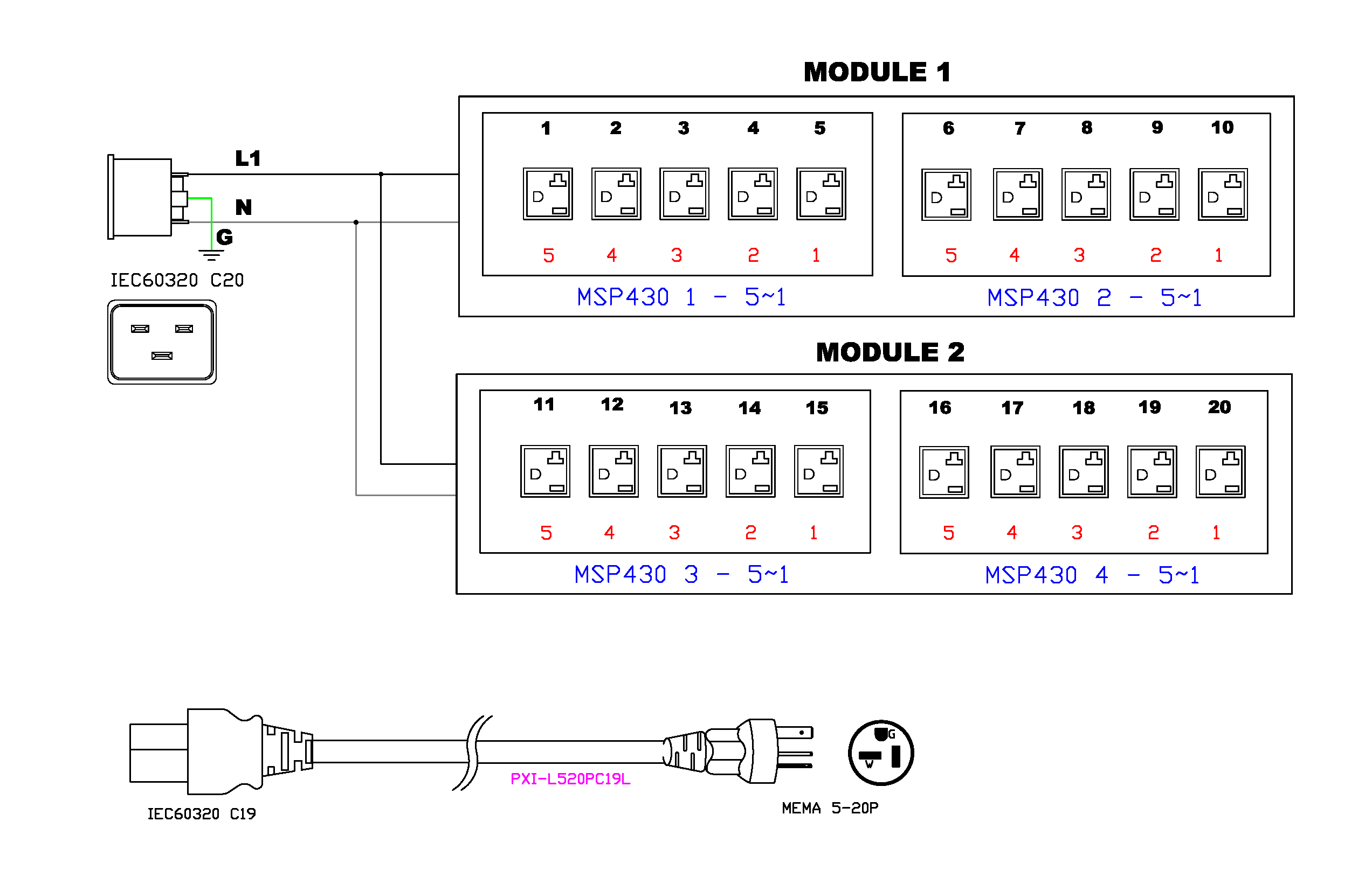 1PH, 120V AC, 20A (16A rated); 20 outlets: 20x NEMA 5-20R; plug: NEMA 5-20P (Rear feed), 1.9kVA; Outlet Metered, 2U horizontal PDU