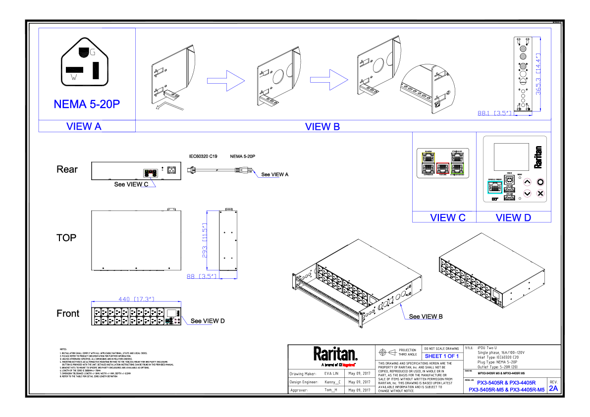 1PH, 120V AC, 20A (16A rated); 20 outlets: 20x NEMA 5-20R; plug: NEMA 5-20P (Rear feed), 1.9kVA; Outlet Metered, 2U horizontal PDU