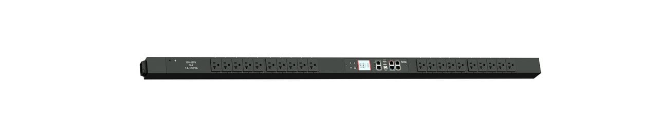 Monitored and switched rack power distribution unit (0U [vertical], 1.9kVA, 20 outlets). INPUT: 120v, 20a - NEMA L5-20P plug (2P3W); OUTPUT: 20@ 5-20R outlets; FEATURES: Billing-Grade (+/- 1%) Energy Metering [kW, kVA, V, A, Power Factor] - per inlet, per outlet; Remote network monitoring via HTML, JSON-RPC, SSH, Telnet, MODBUS/TCP, and SNMPv3. Onboard embedded processor with minimum 536MHz clock speed, 16MB SPI Flash, and 64MB DDR2 RAM. Cascading upto 16 PDU's using single Ethernet or USB connection. Environmental monitoring [temp/humidity] capable – up to 32 sensors. Individual outlet numbers labeled on chassis. Automated deployment via TFTP, DHCP, SSH(CLI), or USB Flash Drives. WiFi Capable. USB Webcam Capable. iPad/iPhone/Android App. Dual 10/100/1000 Ethernet port. Tri-color status LED per receptacle. Max Dimensions 52mm x 65mm x 1298mm (2.1in x 2.6in x 51.1in). Max Weight 3.3 kg. Maximum ambient temperature 60C at full load.