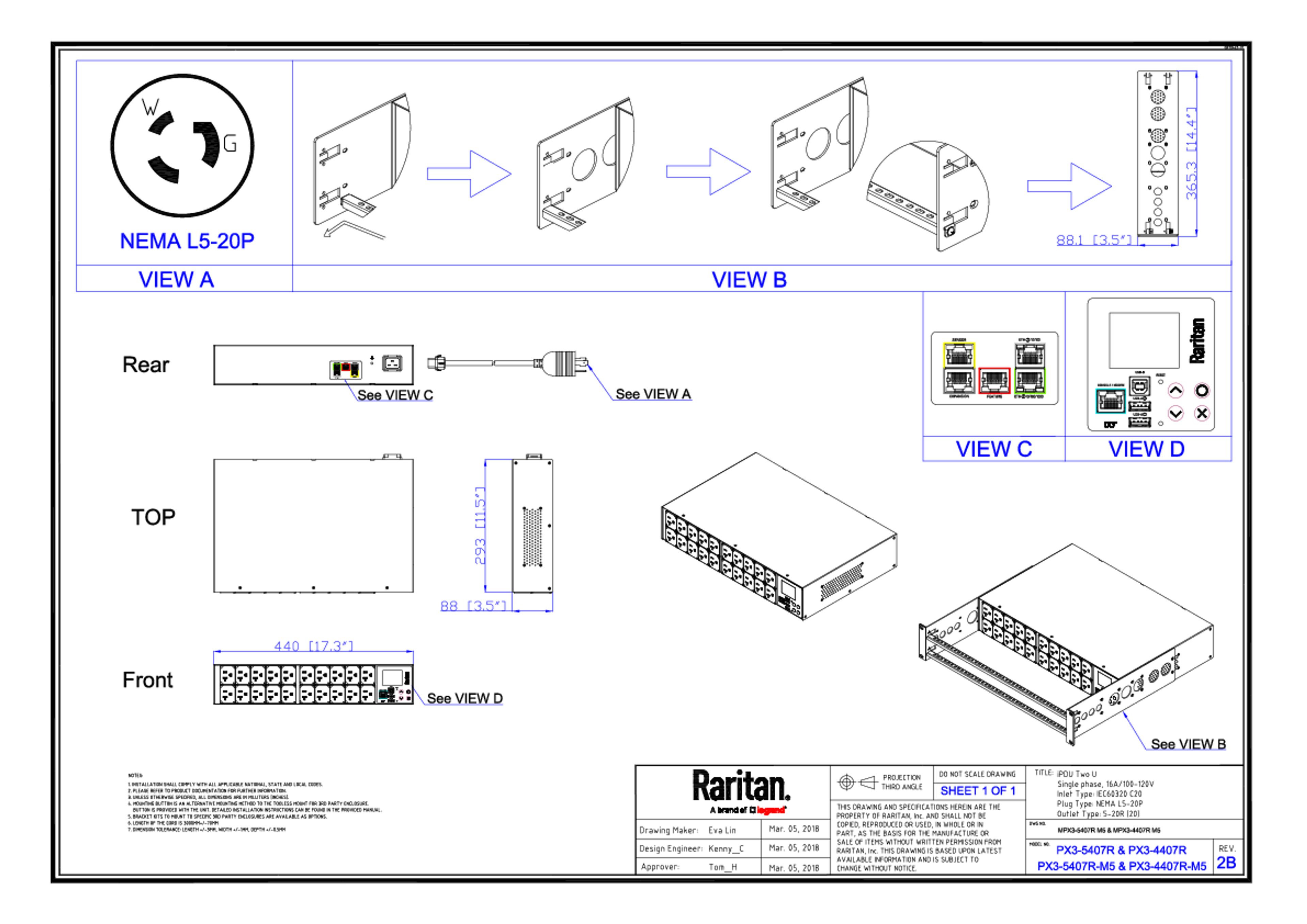1PH, 120V AC, 20A (16A rated); 20 outlets: 20x NEMA 5-20R; plug: NEMA L5-20P (Rear feed), 1.9kVA; Outlet Metered, 2U horizontal PDU