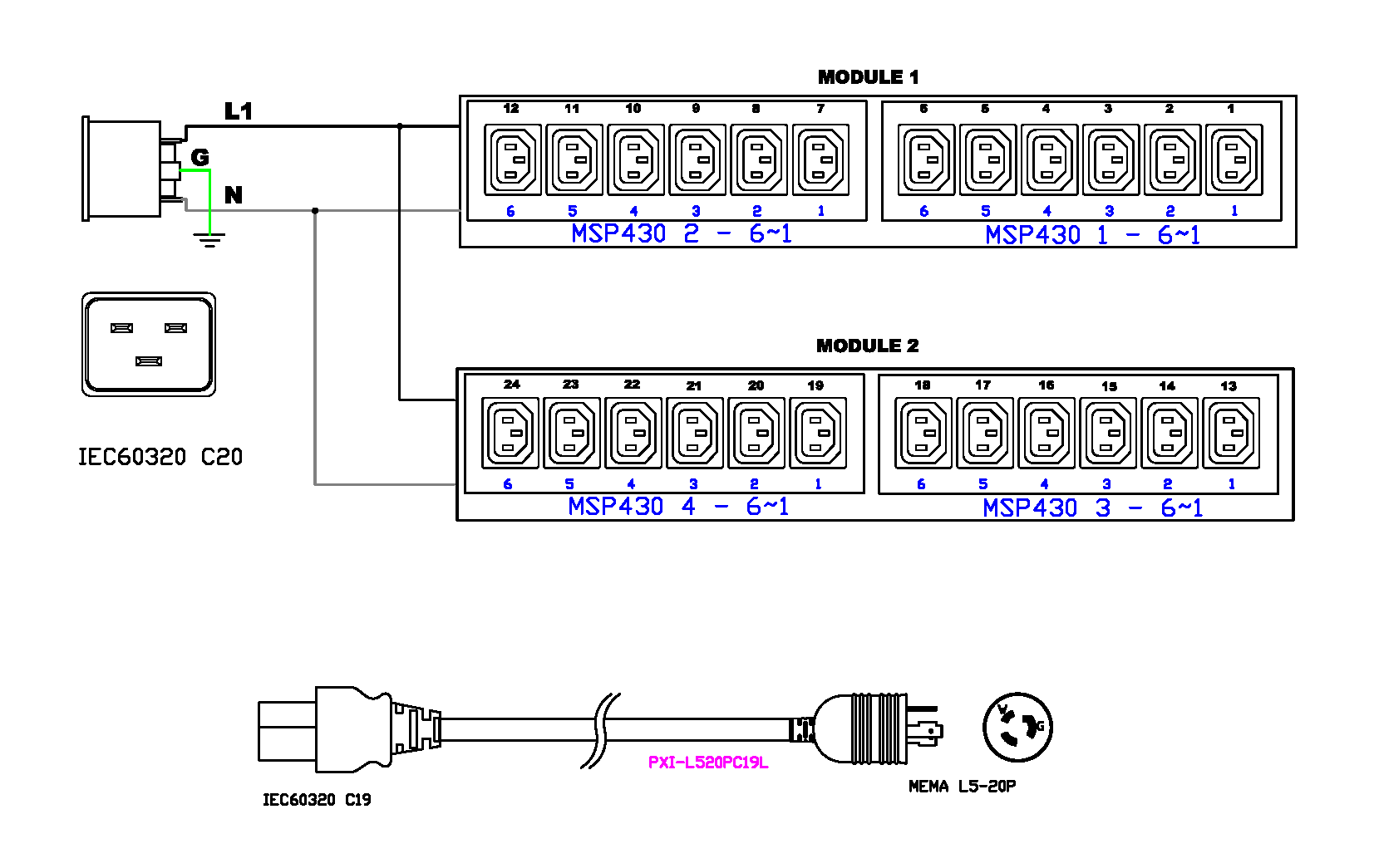 1PH, 120V AC, 20A (16A rated); 24 outlets: 24x C13; plug: NEMA L5-20P (Bottom-bottom feed), 1.9kVA; Outlet Metered/Switched, Zero U vertical PDU