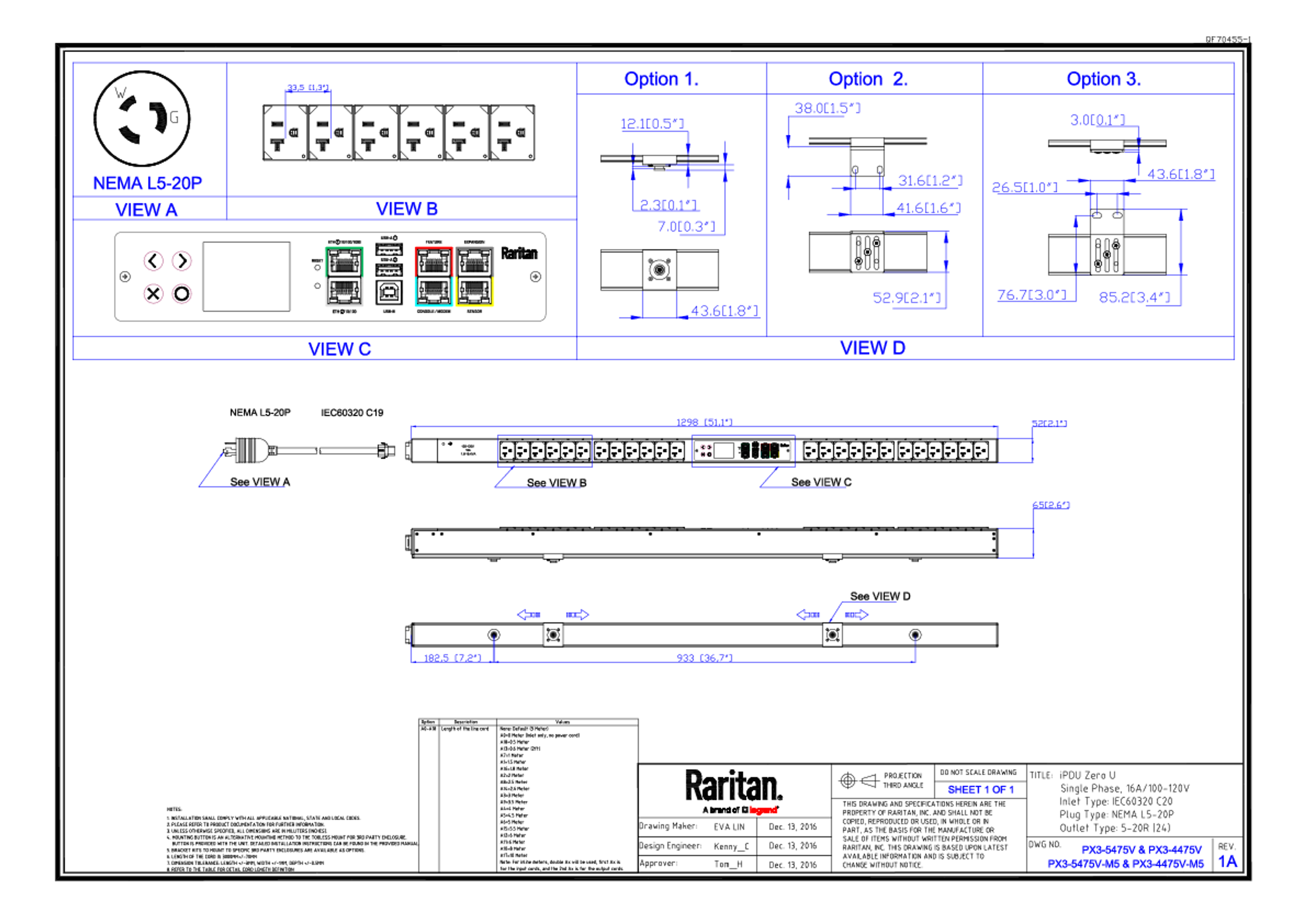 1PH, 120V AC, 20A (16A rated); 24 outlets: 24x NEMA 5-20R; plug: NEMA L5-20P (Bottom-bottom feed), 1.9kVA; Outlet Metered, Zero U vertical PDU