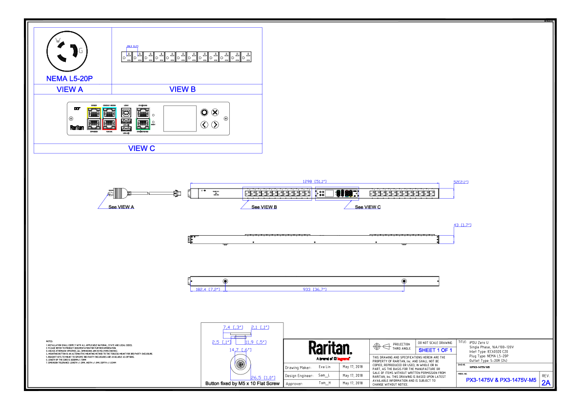 1PH, 120V AC, 20A (16A rated); 24 outlets: 24x NEMA 5-20R; plug: NEMA L5-20P (Bottom-bottom feed), 1.9kVA; Unit Metered, Zero U vertical PDU