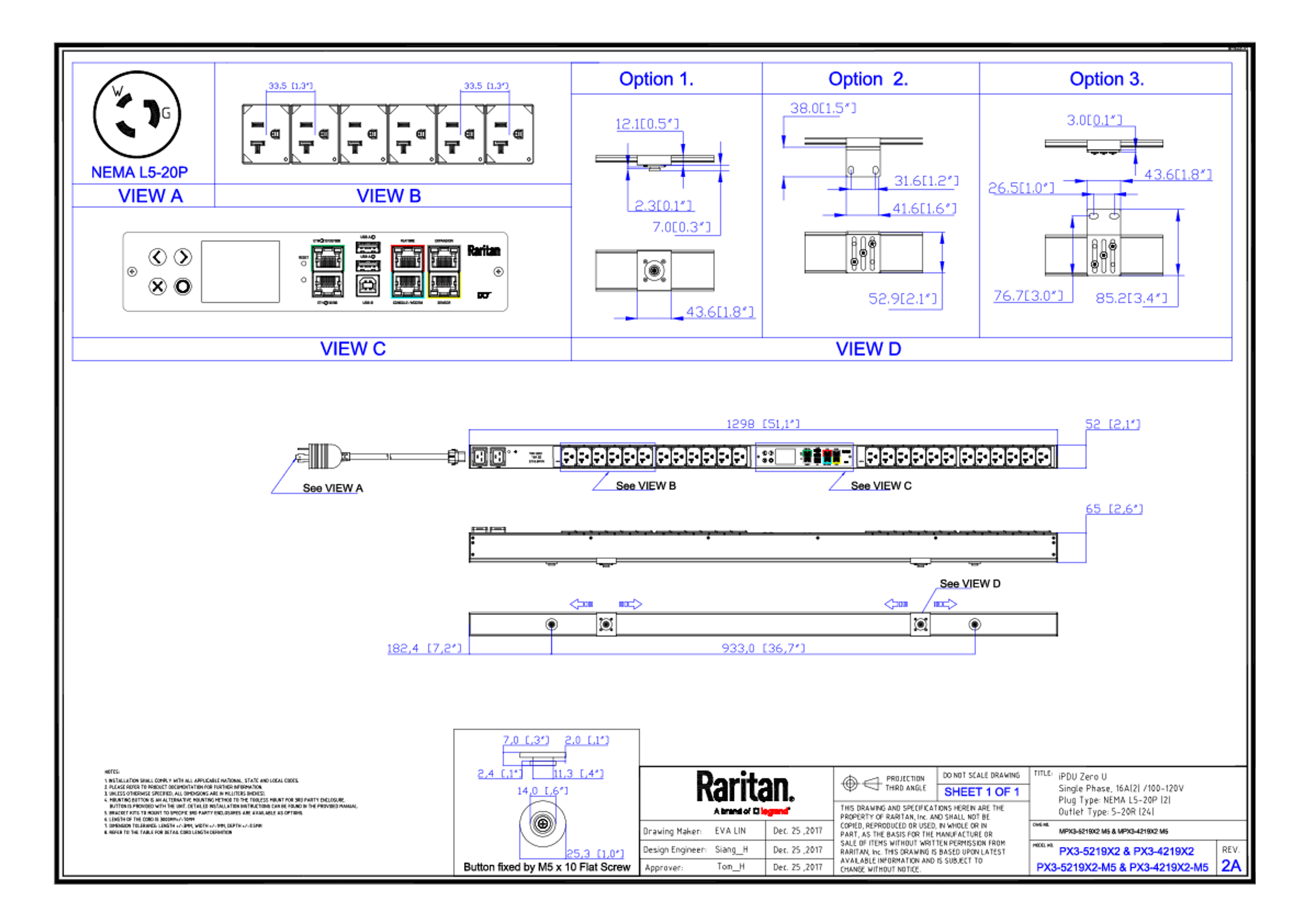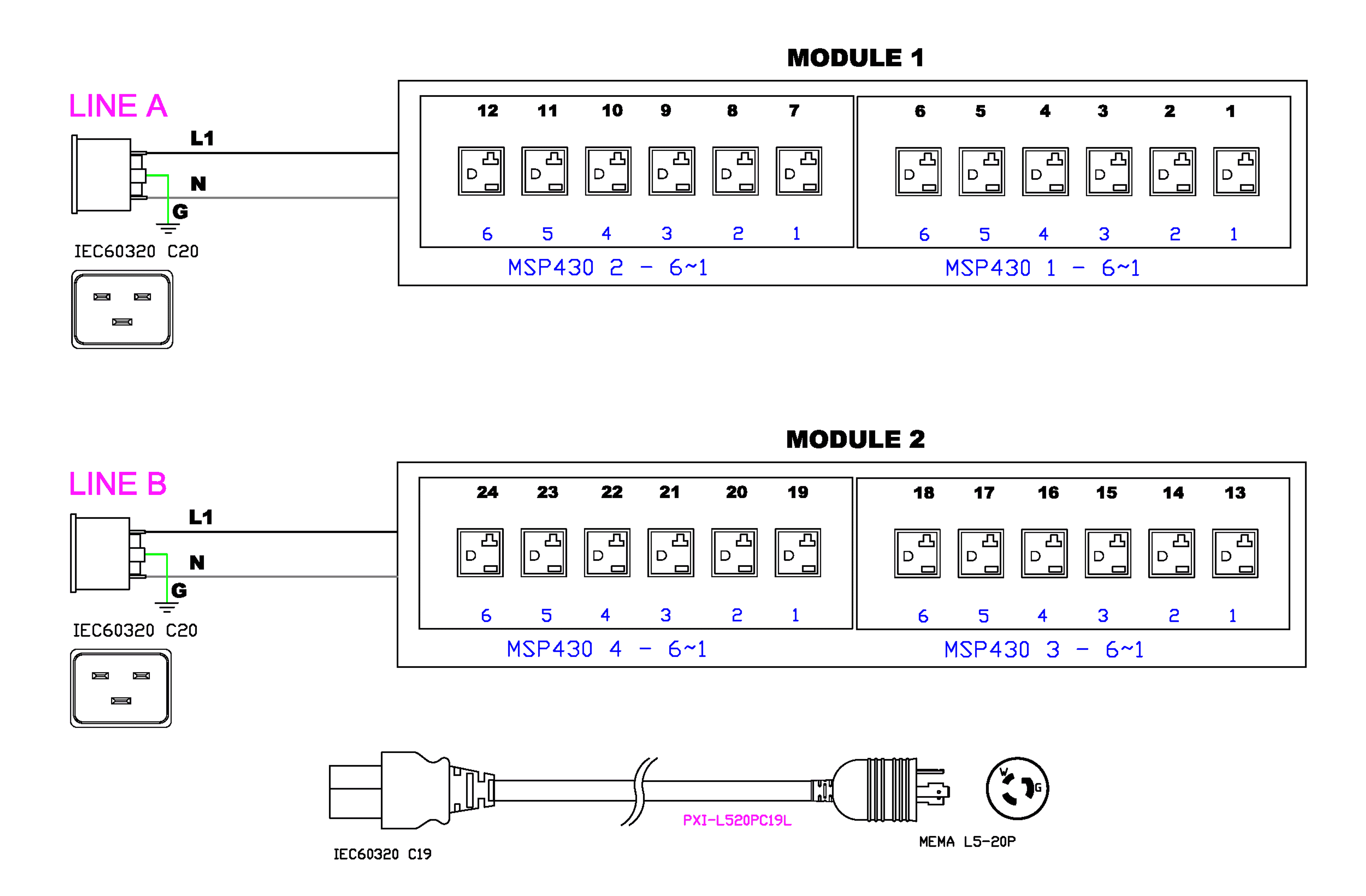 1PH, 120V AC, 20A (16A rated); 24 outlets: 24x NEMA 5-20R; plug: NEMA L5-20P (Bottom-front feed), 1.9kVA; Outlet Metered/Switched, Zero U vertical PDU