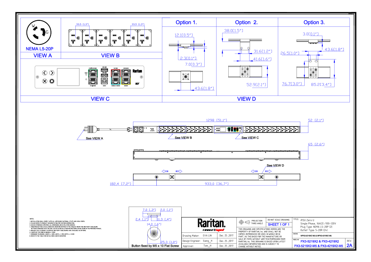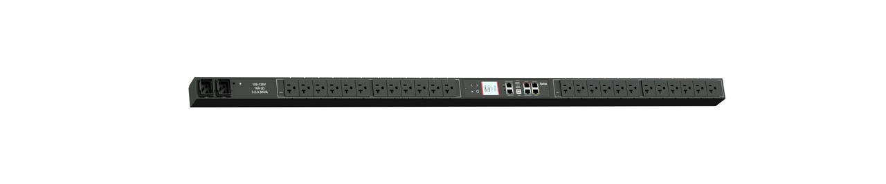 Monitored and switched rack power distribution unit (0U [vertical], 3.8kVA, 24 outlets). INPUT: 120v, 20a - NEMA L5-20P plug (2P3W); OUTPUT: 24@ 5-20R outlets; FEATURES: Billing-Grade (+/- 1%) Energy Metering [kW, kVA, V, A, Power Factor] - per inlet, per outlet; Remote network monitoring via HTML, JSON-RPC, SSH, Telnet, MODBUS/TCP, and SNMPv3. Onboard embedded processor with minimum 536MHz clock speed, 16MB SPI Flash, and 64MB DDR2 RAM. Cascading upto 16 PDU's using single Ethernet or USB connection. Environmental monitoring [temp/humidity] capable – up to 32 sensors. Individual outlet numbers labeled on chassis. Automated deployment via TFTP, DHCP, SSH(CLI), or USB Flash Drives. WiFi Capable. USB Webcam Capable. iPad/iPhone/Android App. Dual 10/100/1000 Ethernet port. Tri-color status LED per receptacle. Max Dimensions 52mm x 65mm x 1298mm (2.1in x 2.6in x 51.1in). Max Weight 3.5 kg. Maximum ambient temperature 60C at full load.