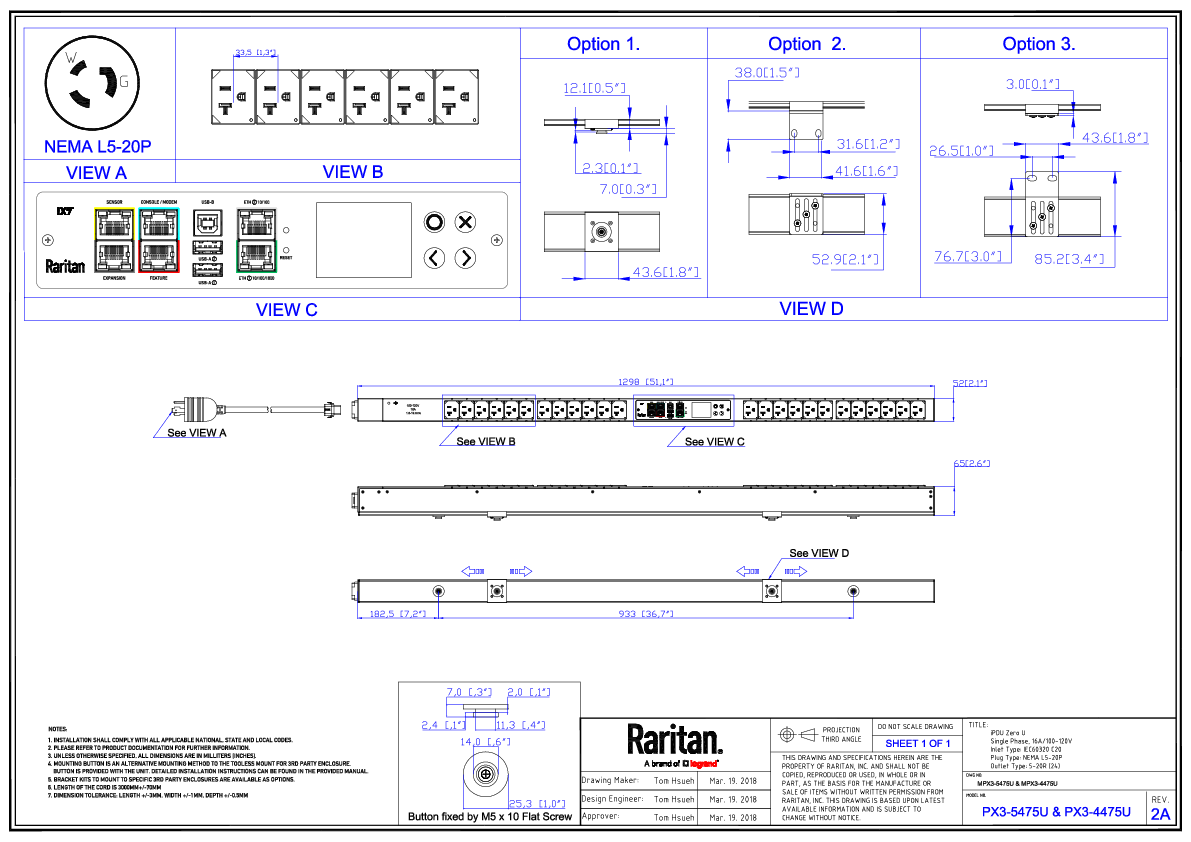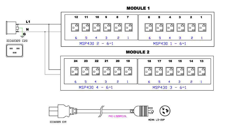 1PH, 120V AC, 20A (16A rated); 24 outlets: 24x NEMA 5-20R; plug: NEMA L5-20P (Top-top feed), 1.9kVA; Outlet Metered/Switched, Zero U vertical PDU
