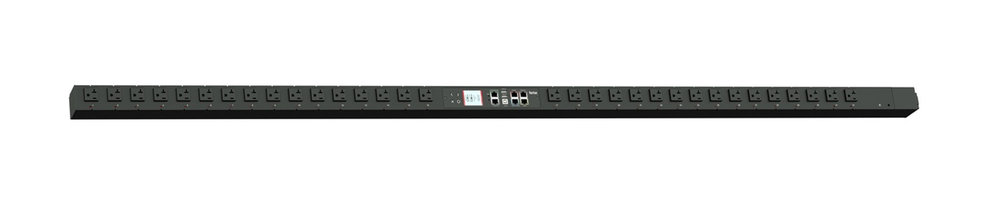 Monitored and switched rack power distribution unit (0U [vertical], 1.9kVA, 32 outlets). INPUT: 120v, 20a - NEMA L5-20P plug (2P3W); OUTPUT: 32@ 5-20R outlets; FEATURES: Billing-Grade (+/- 1%) Energy Metering [kW, kVA, V, A, Power Factor] - per inlet, per outlet; Remote network monitoring via HTML, JSON-RPC, SSH, Telnet, MODBUS/TCP, and SNMPv3. Onboard embedded processor with minimum 536MHz clock speed, 16MB SPI Flash, and 64MB DDR2 RAM. Cascading upto 16 PDU's using single Ethernet or USB connection. Environmental monitoring [temp/humidity] capable – up to 32 sensors. Individual outlet numbers labeled on chassis. Automated deployment via TFTP, DHCP, SSH(CLI), or USB Flash Drives. WiFi Capable. USB Webcam Capable. iPad/iPhone/Android App. Dual 10/100/1000 Ethernet port. Tri-color status LED per receptacle. Max Dimensions 52mm x 65mm x 1856mm (2.1in x 2.6in x 73.1in). Max Weight 12.5 kg. Maximum ambient temperature 60C at full load.