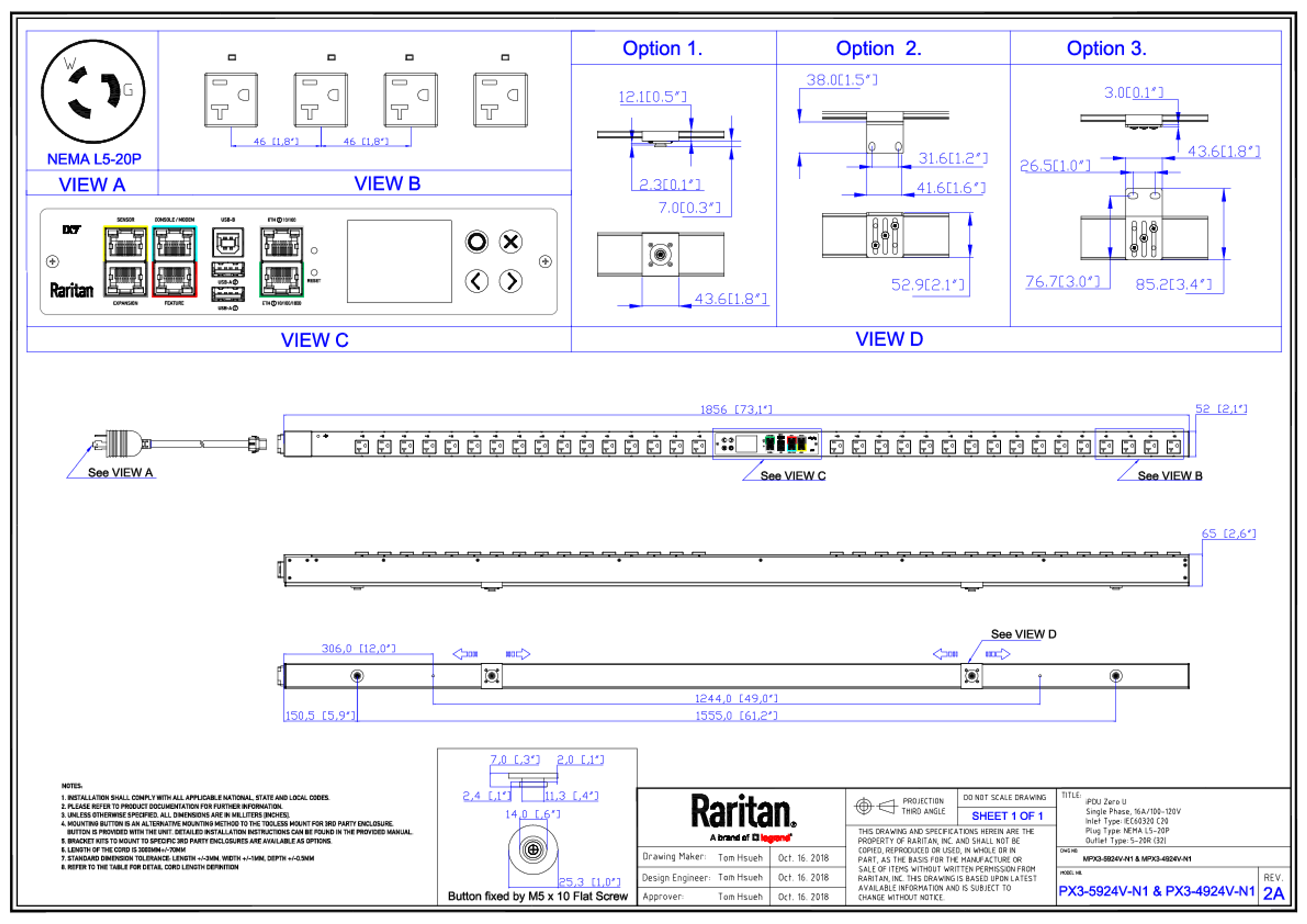 1PH, 120V AC, 20A (16A rated); 32 outlets: 32x NEMA 5-20R; plug: NEMA L5-20P (Bottom-bottom feed), 1.9kVA; Outlet Metered/Switched, Zero U vertical PDU