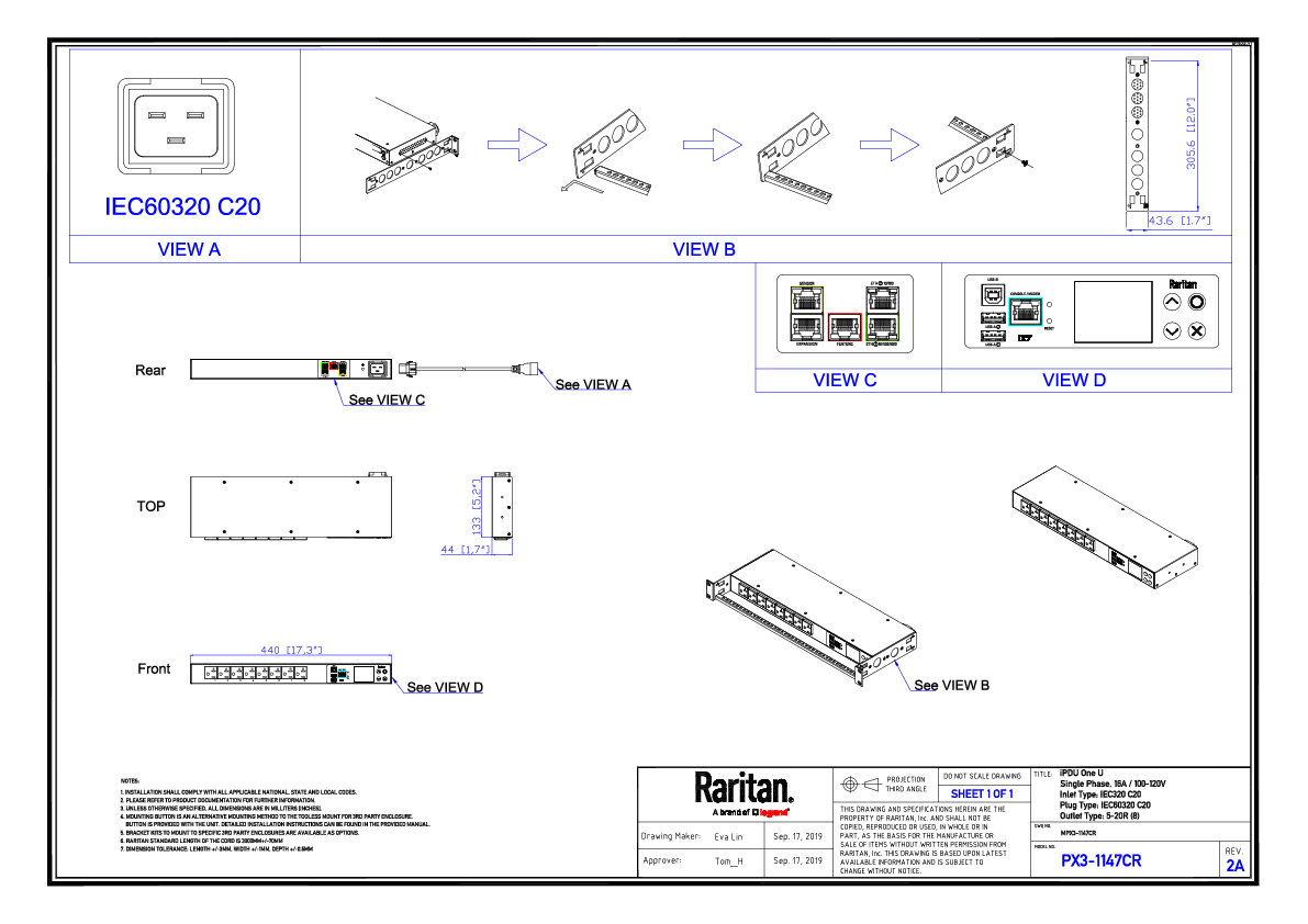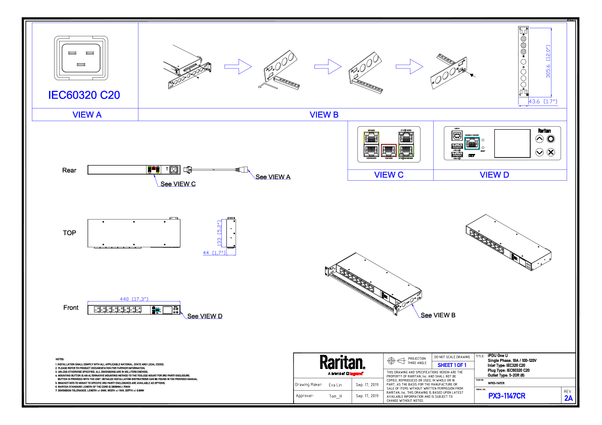 1PH, 120V AC, 20A (16A rated); 8 outlets: 8x NEMA 5-20R; plug: IEC 60320 C20 (Rear feed), 1.9kVA; Unit Metered, 1U horizontal PDU