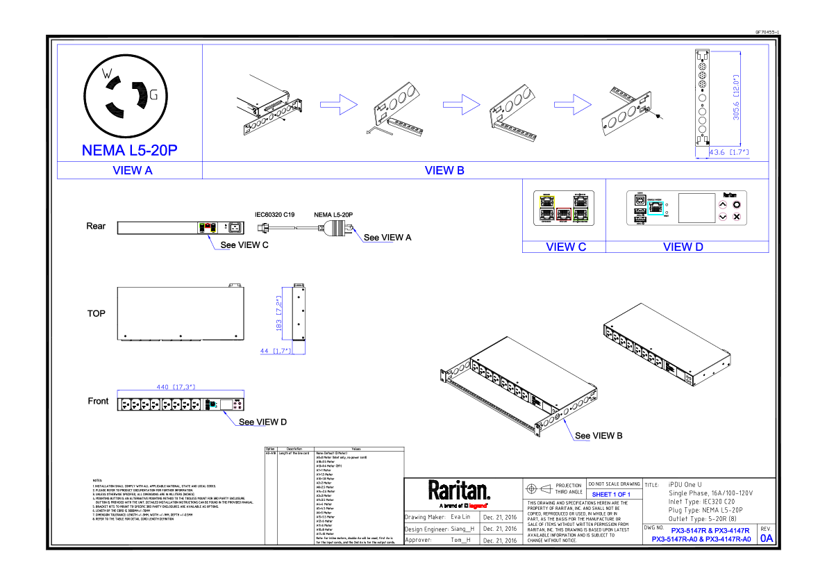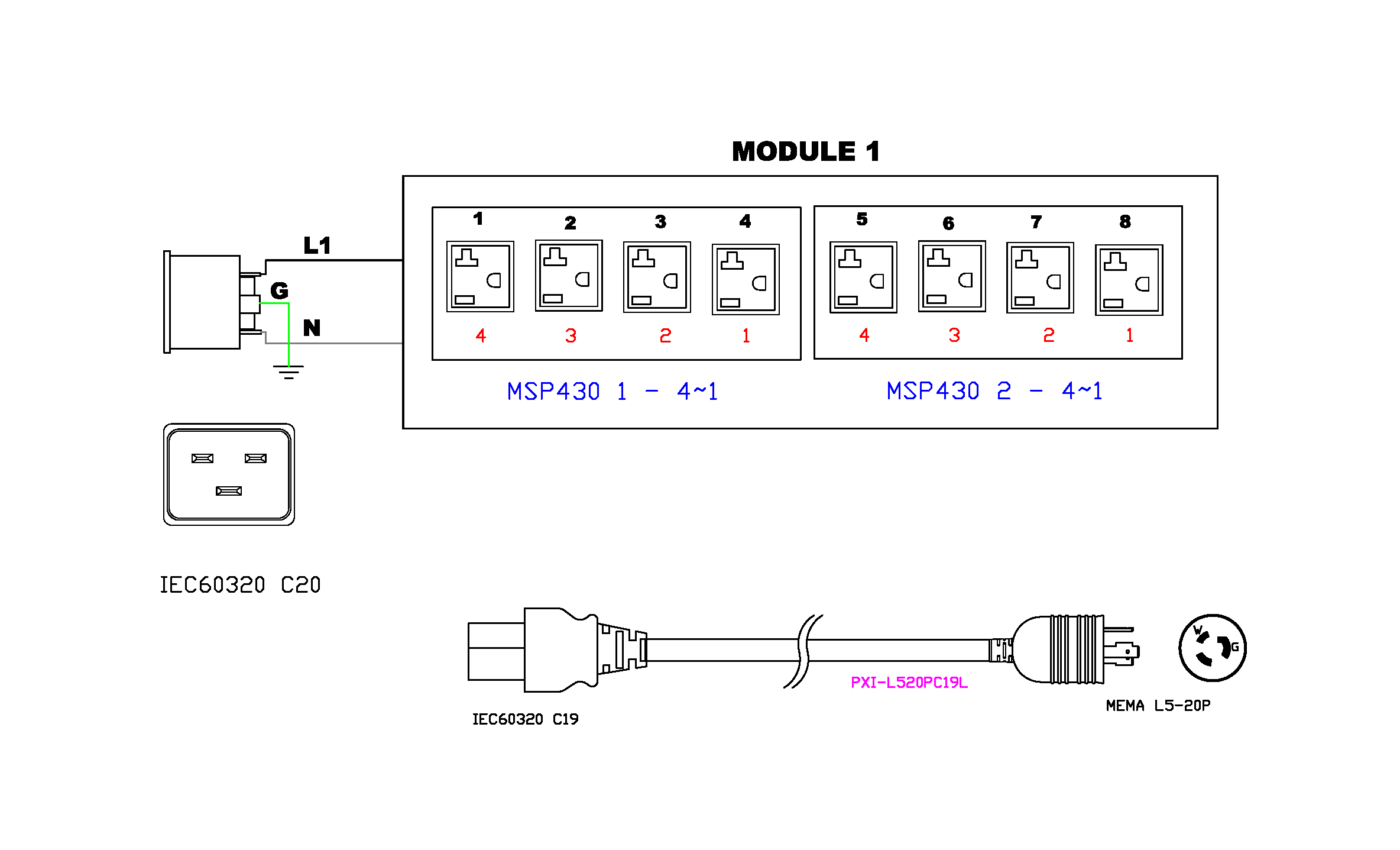 1PH, 120V AC, 20A (16A rated); 8 outlets: 8x NEMA 5-20R; plug: NEMA L5-20P (Rear feed), 1.9kVA; Outlet Metered, 1U horizontal PDU