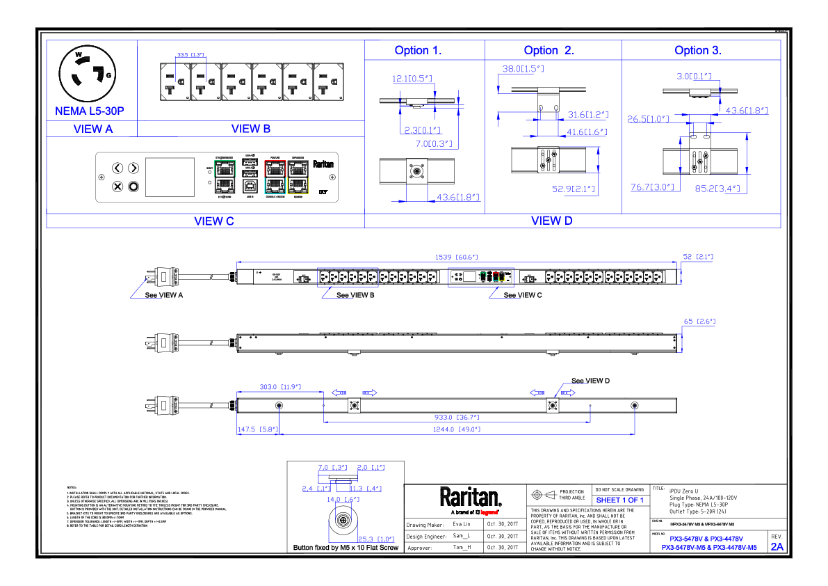 1PH, 120V AC, 30A (24A rated); 24 outlets: 24x NEMA 5-20R; plug: NEMA L5-30P (Bottom-bottom feed), 2.9kVA; Outlet Metered/Switched, Zero U vertical PDU