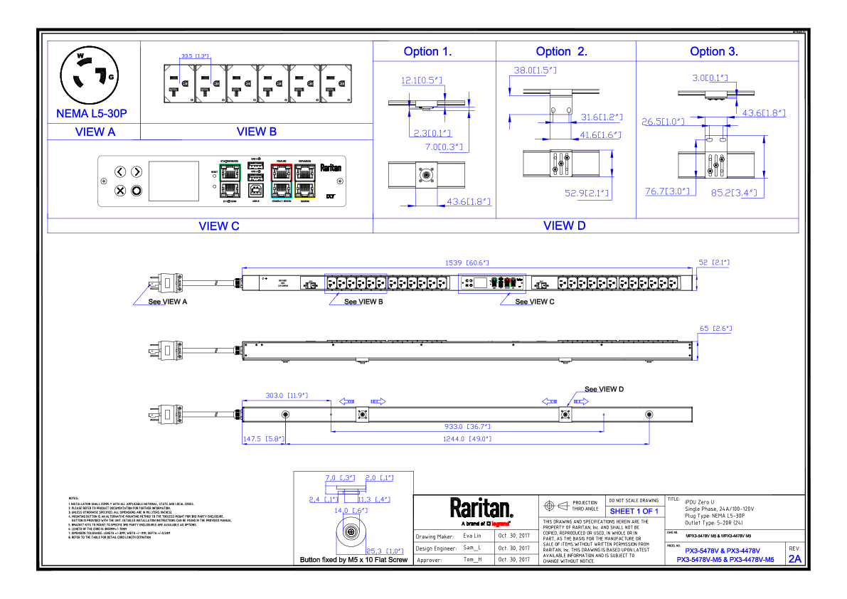 1PH, 120V AC, 30A (24A rated); 24 outlets: 24x NEMA 5-20R; plug: NEMA L5-30P (Bottom-bottom feed), 2.9kVA; Outlet Metered, Zero U vertical PDU