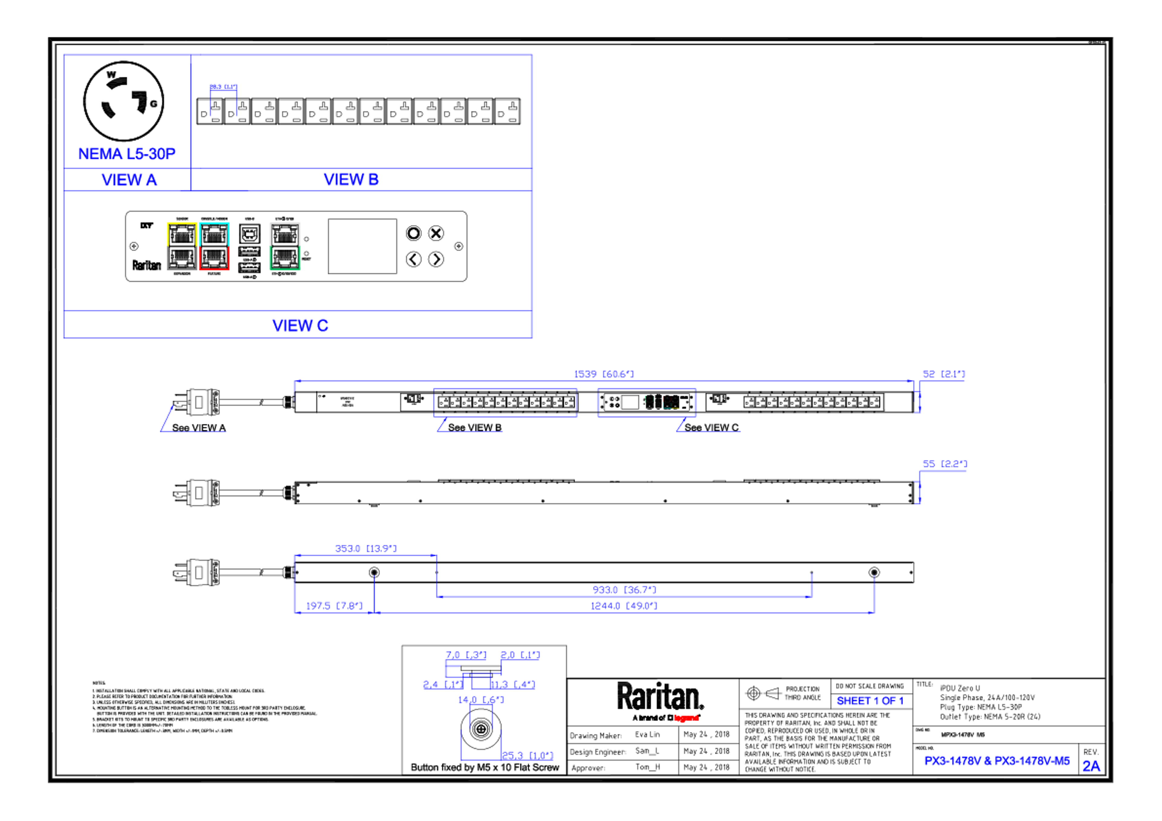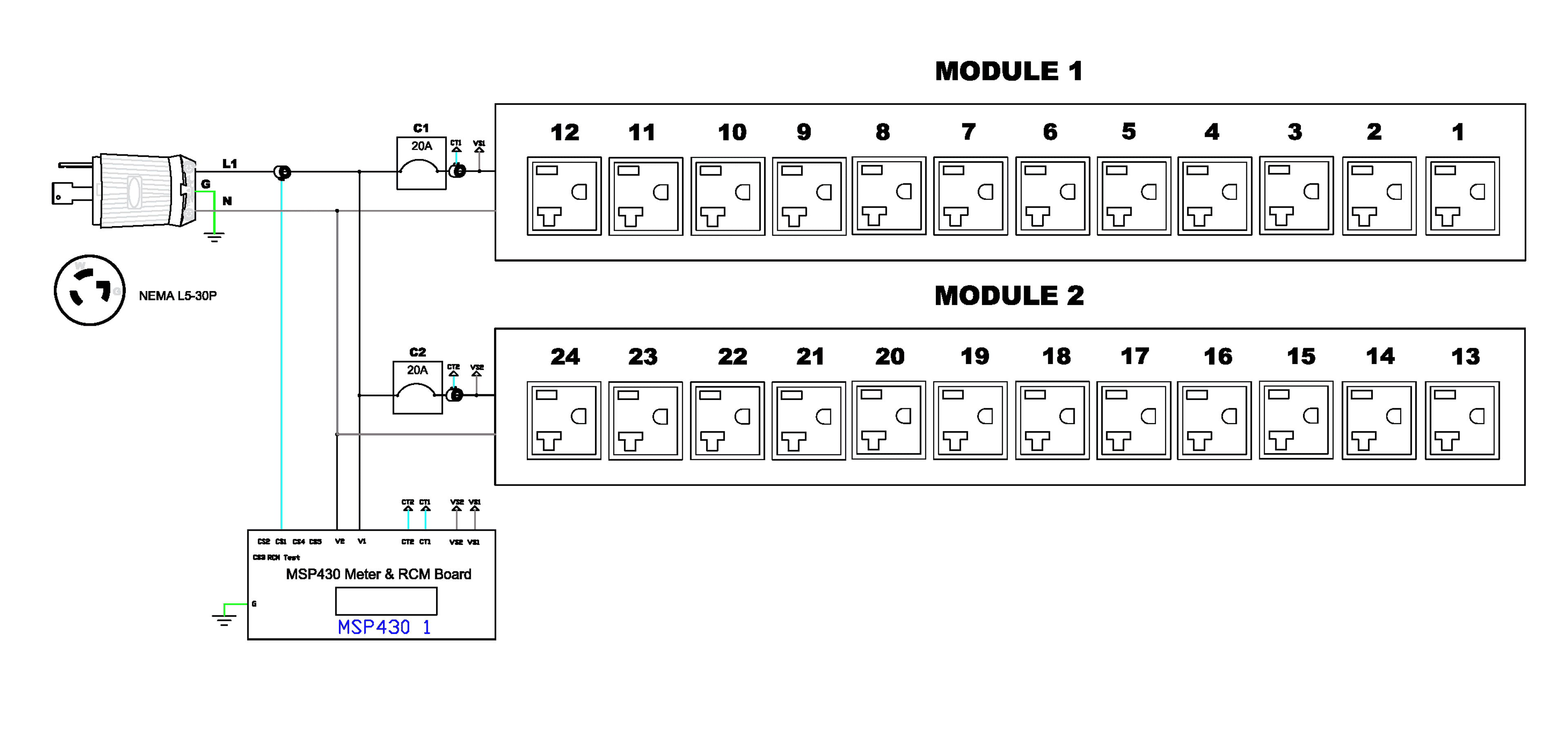 1PH, 120V AC, 30A (24A rated); 24 outlets: 24x NEMA 5-20R; plug: NEMA L5-30P (Bottom-bottom feed), 2.9kVA; Unit Metered, Zero U vertical PDU
