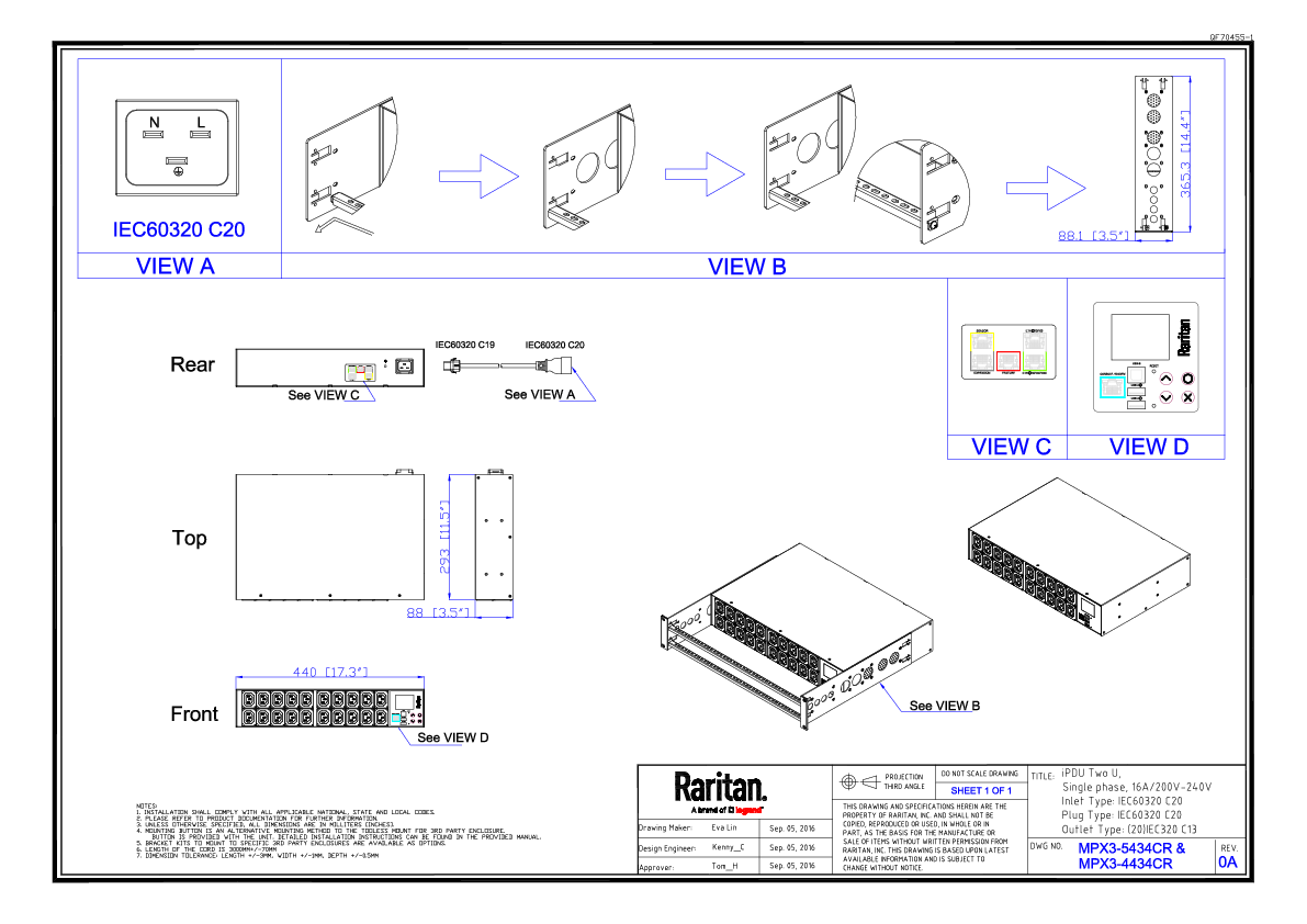 Raritan PX3-4434CR 1PH 208V AC 16A 20 outlets 2U
