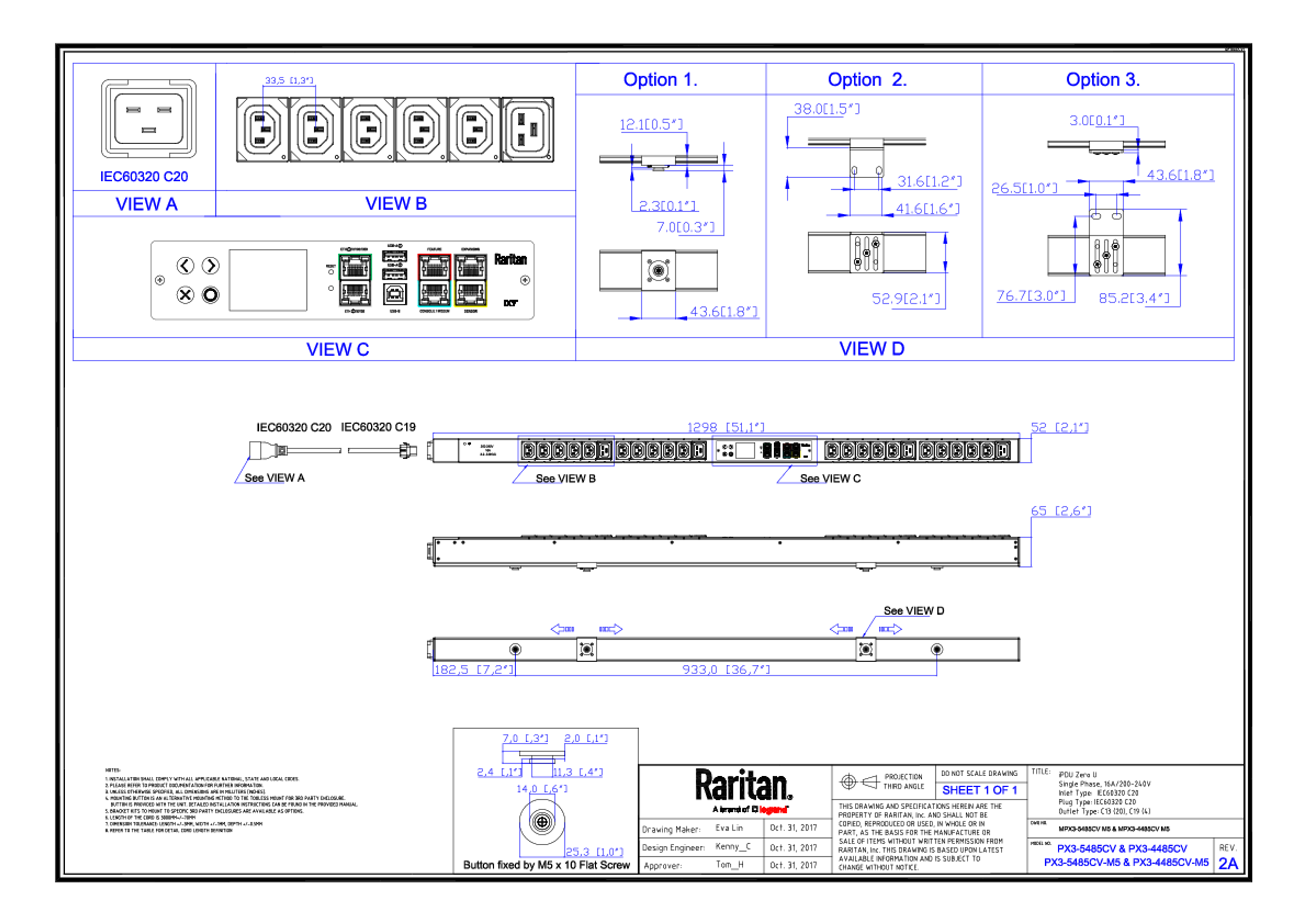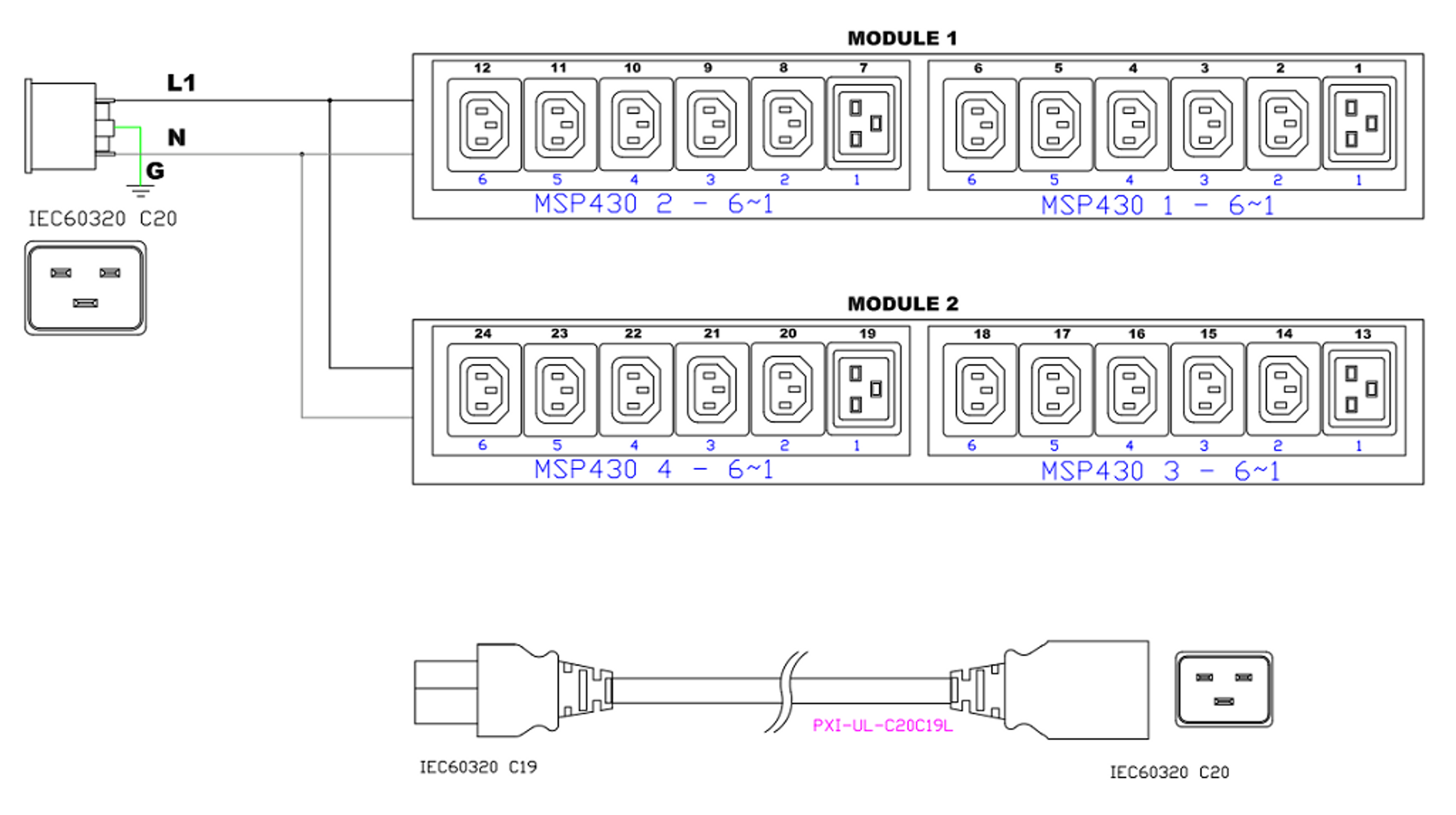 1PH, 208V AC, 16A (16A rated); 24 outlets: 20x C13, 4x C19; plug: IEC 60320 C20 (Bottom-bottom feed), 3.3kVA; Outlet Metered/Switched, Zero U vertical PDU
