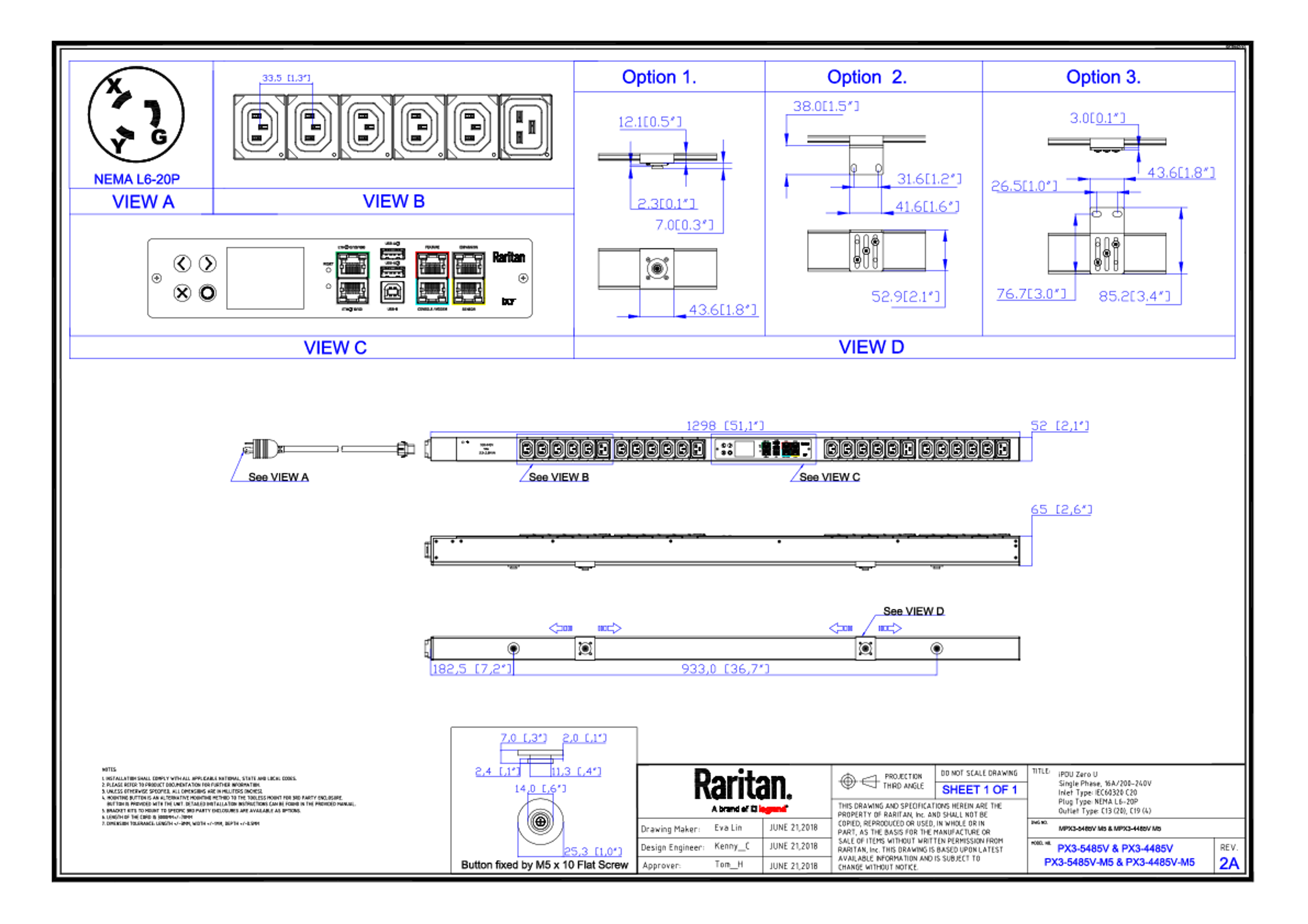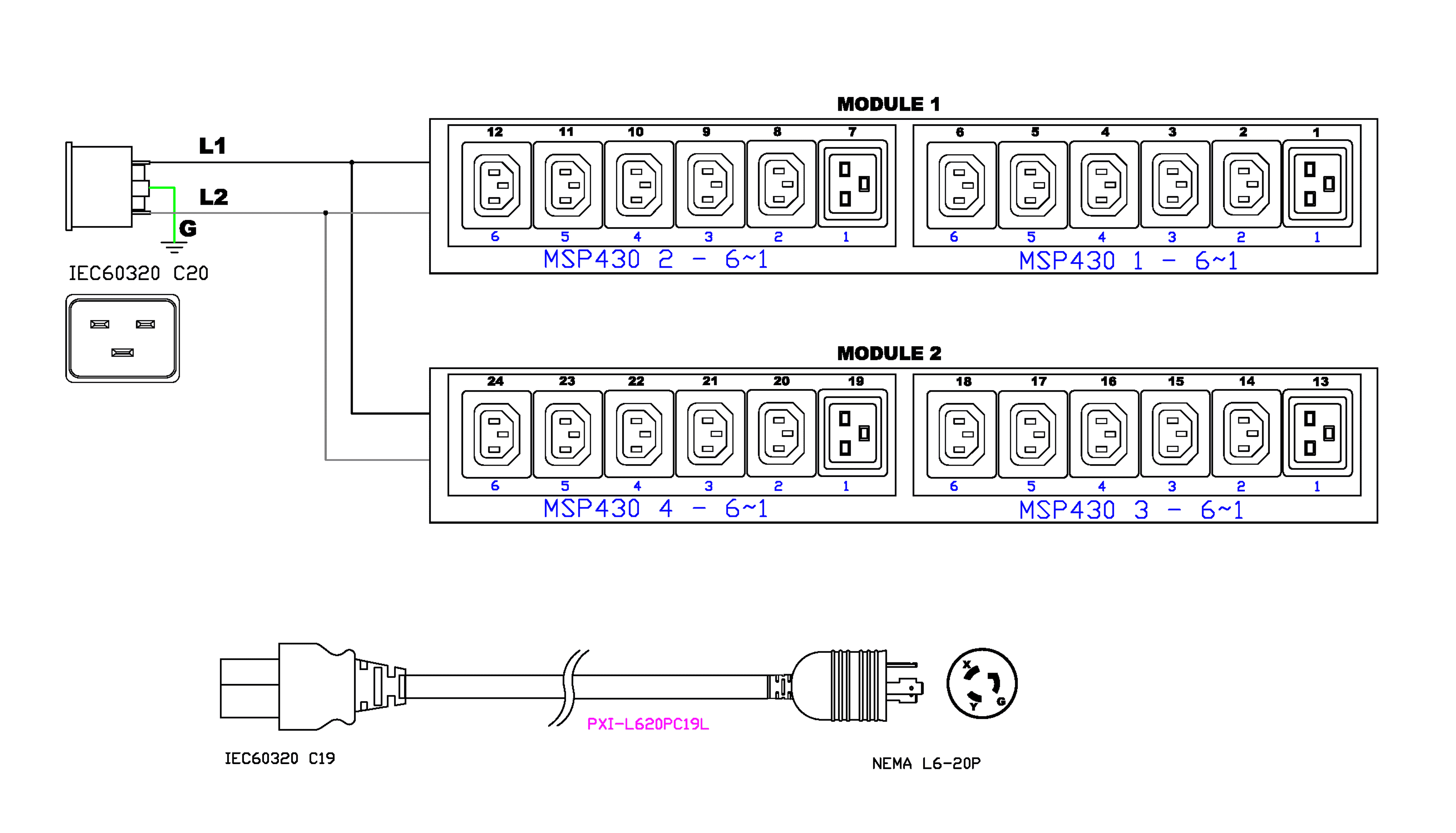 1PH, 208V AC, 16A (16A rated); 24 outlets: 20x C13, 4x C19; plug: NEMA L6-20P (Bottom-bottom feed), 3.3kVA; Outlet Metered/Switched, Zero U vertical PDU