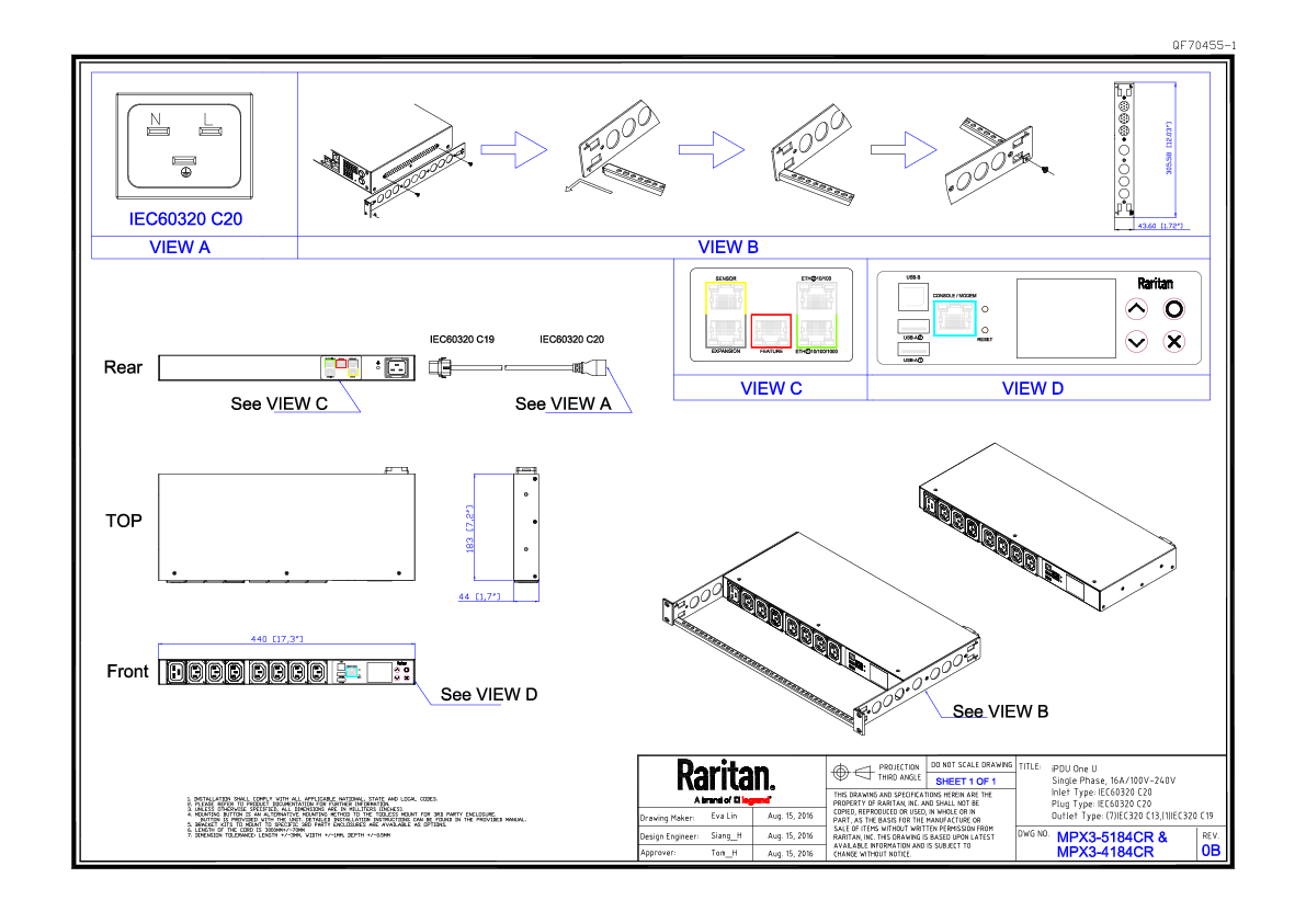 1PH, 208V AC, 16A (16A rated); 8 outlets: 7x C13, 1x C19; plug: IEC 60320 C20 (Rear feed)