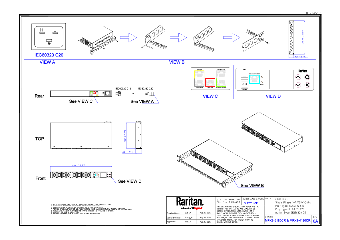 Monitored and switched rack power distribution unit (1U [horizontal], 3.3kVA, 8 outlets). INPUT: 208v, 16a - IEC 60320 C20 plug (2P3W); OUTPUT: 8@ C13 outlets; FEATURES: Billing-Grade (+/- 1%) Energy Metering [kW, kVA, V, A, Power Factor] - per inlet, per outlet; Remote network monitoring via HTML, JSON-RPC, SSH, Telnet, MODBUS/TCP, and SNMPv3. Onboard embedded processor with minimum 536MHz clock speed, 16MB SPI Flash, and 64MB DDR2 RAM. Cascading upto 16 PDU's using single Ethernet or USB connection. Environmental monitoring [temp/humidity] capable – up to 32 sensors. Individual outlet numbers labeled on chassis. Automated deployment via TFTP, DHCP, SSH(CLI), or USB Flash Drives. WiFi Capable. USB Webcam Capable. iPad/iPhone/Android App. Dual 10/100/1000 Ethernet port. Tri-color status LED per receptacle. Max Dimensions 440mm x 183mm x 44mm (17.3in x 7.2in x 1.7in). Max Weight 4 kg. Maximum ambient temperature 60C at full load.