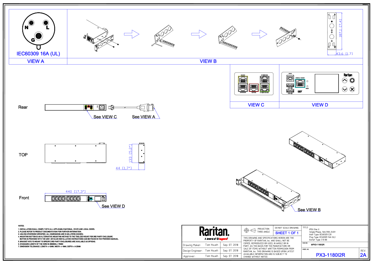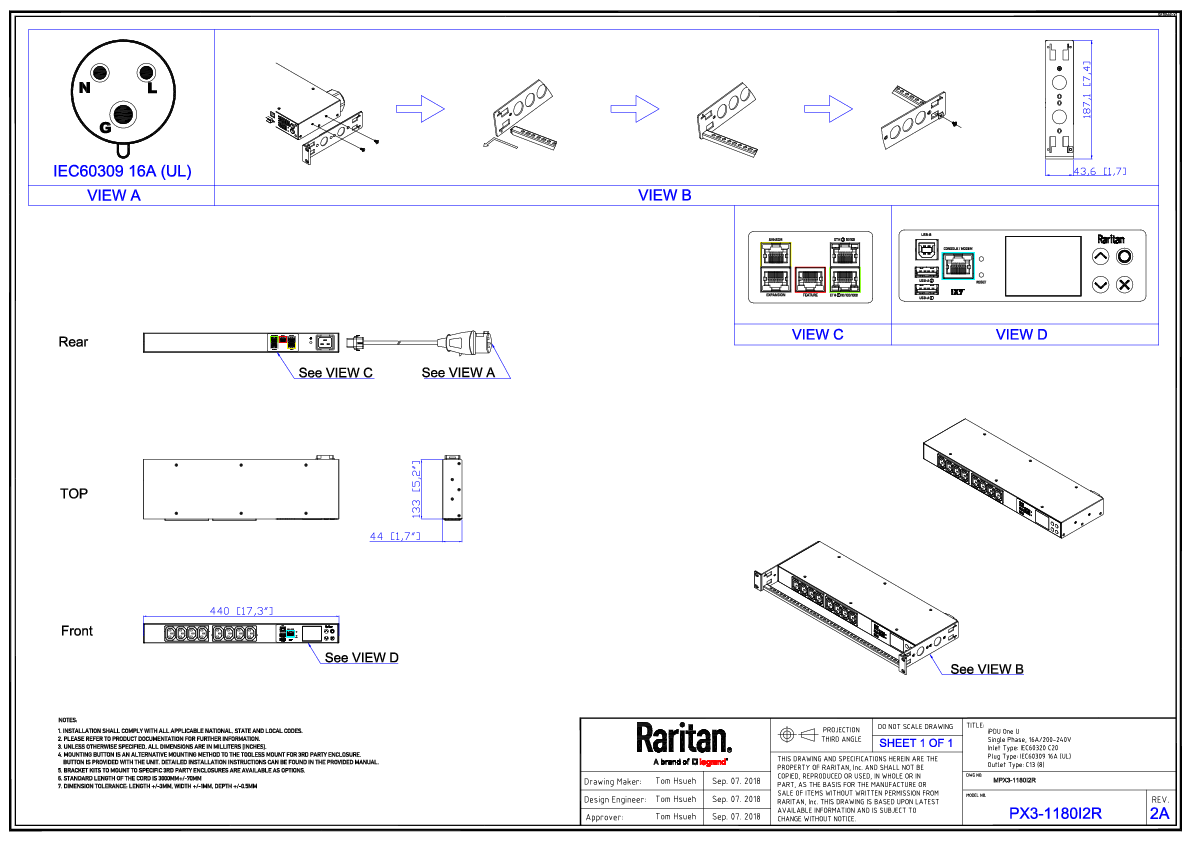 1PH, 208V AC, 20A (16A rated); 8 outlets: 8x C13; plug: IEC 60309 2P+E 16A (Rear feed), 3.3kVA; Unit Metered, 1U horizontal PDU