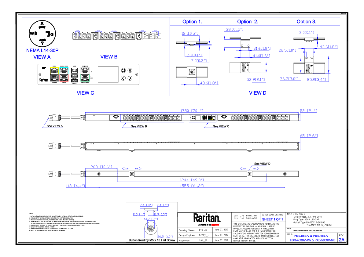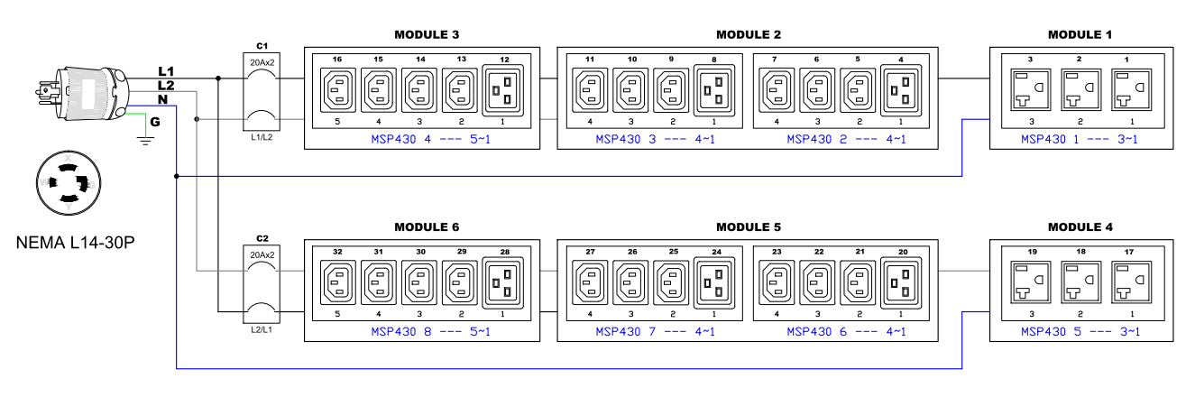 1PH, 208V AC, 24A (24A rated); 32 outlets: 6x NEMA 5-20R, 20x C13, 6x C19; plug: NEMA L14-30P (Bottom-bottom feed), 5.0kVA; Outlet Metered, Zero U vertical PDU