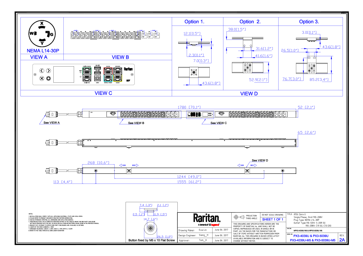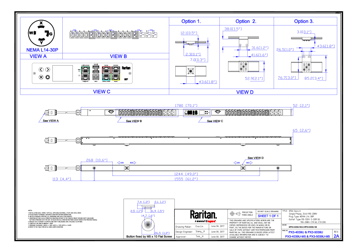 1PH, 208V AC, 24A (24A rated); 32 outlets: 6x NEMA 5-20R, 20x C13, 6x C19; plug: NEMA L14-30P (Top-top feed), 5.0kVA; Outlet Metered, Zero U vertical PDU