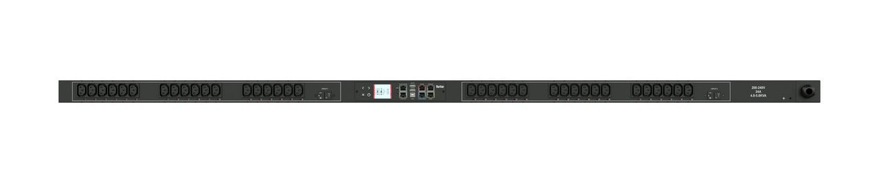 Monitored rack power distribution unit (0U [vertical], 5kVA, 20 outlets). INPUT: 208v, 30a - NEMA L6-30P plug (2P3W); OUTPUT: 16@ C13, 4@ C19 outlets; on 2@ 2-pole, 20a Overcurrent Protectors; FEATURES: Billing-Grade (+/- 1%) Energy Metering [kW, kVA, V, A, Power Factor] - per inlet, per breaker/fuse, per outlet; Color, matrix LCD display : Voltage, current, or active power (per line, per breaker, or per receptacle / outlet); Alarms; Configuration information (name, ratings, IP / Networking information). Auto-flip orientation; Field-Replaceable, hot-swappable network module with 536MHz processor, 16MB SPI Flash, and 64MB DDR2 RAM; Gigabit(10/100/1000) Ethernet port. Secondary, redundant Ethernet port. Redundant power sharing between network modules.Remote network monitoring via HTML, JSON-RPC, SSH, Telnet, MODBUS/TCP, and SNMPv3. Environmental monitoring [temp/humidity] capable of up to 32 sensors. Individual outlet numbers labeled on chassis. Automated deployment via TFTP, DHCP/PXE, SSH(CLI), or USB Flash Drives. WiFi Capable. USB Webcam Capable. iPad/iPhone/Android App. Tri-color status LED per receptacle. Breaker metering and alarming (0V detection). Max Dimensions 52mm x 65mm x 1539mm (2.1in x 2.6in x 60.6in). Maximum ambient temperature 60C at full load.
